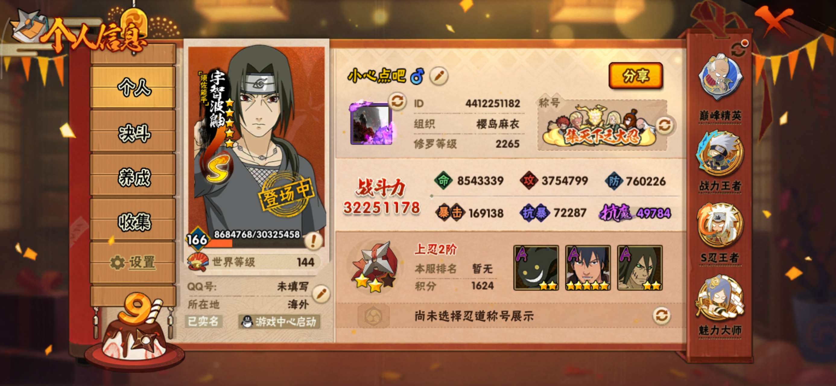 首页 > 租号大厅 > 火影忍者 > QQ账号/QQ账号 > (精品号)53S 102A 410忍 3200w战 金身水门 漂泊土 须佐卡卡西 艾 桃式 解班 创立柱间 永恒佐助 九喇嘛 幻卡…