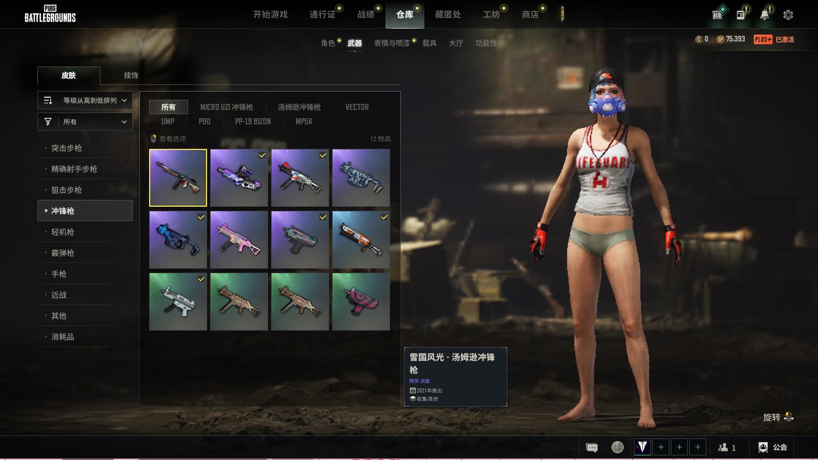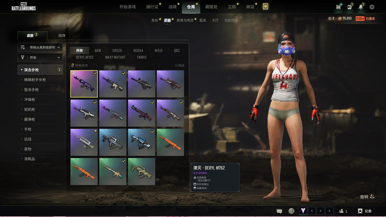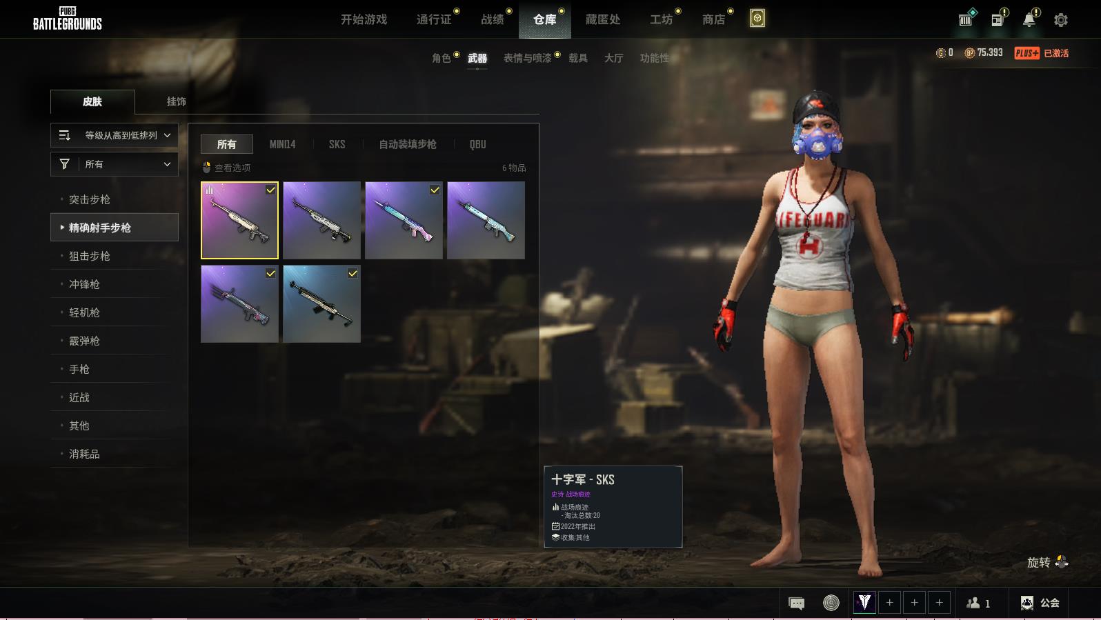 PUBG豪华版绝地求生可排位,湮灭-BERYLM762;十字军-SKS;品红色烟雾弹投掷武器已上锁;数码沙漠迷彩-M416;分秒必争-QBZ;金王朝-087;分