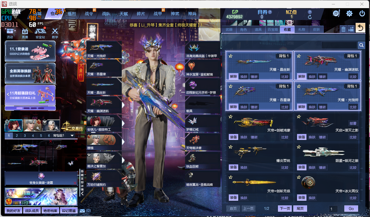 全装\天耀套\望舒龙曦凌霜\锋影强能臂铠\英雄影戍焚宵玄烬璃鸢金翎强盾剑风羲禹游侠春溟铁卫\三级百宝箱\塔防全能卡\蓝羽玄扇双姝\绯羽M233\天穹裁决者