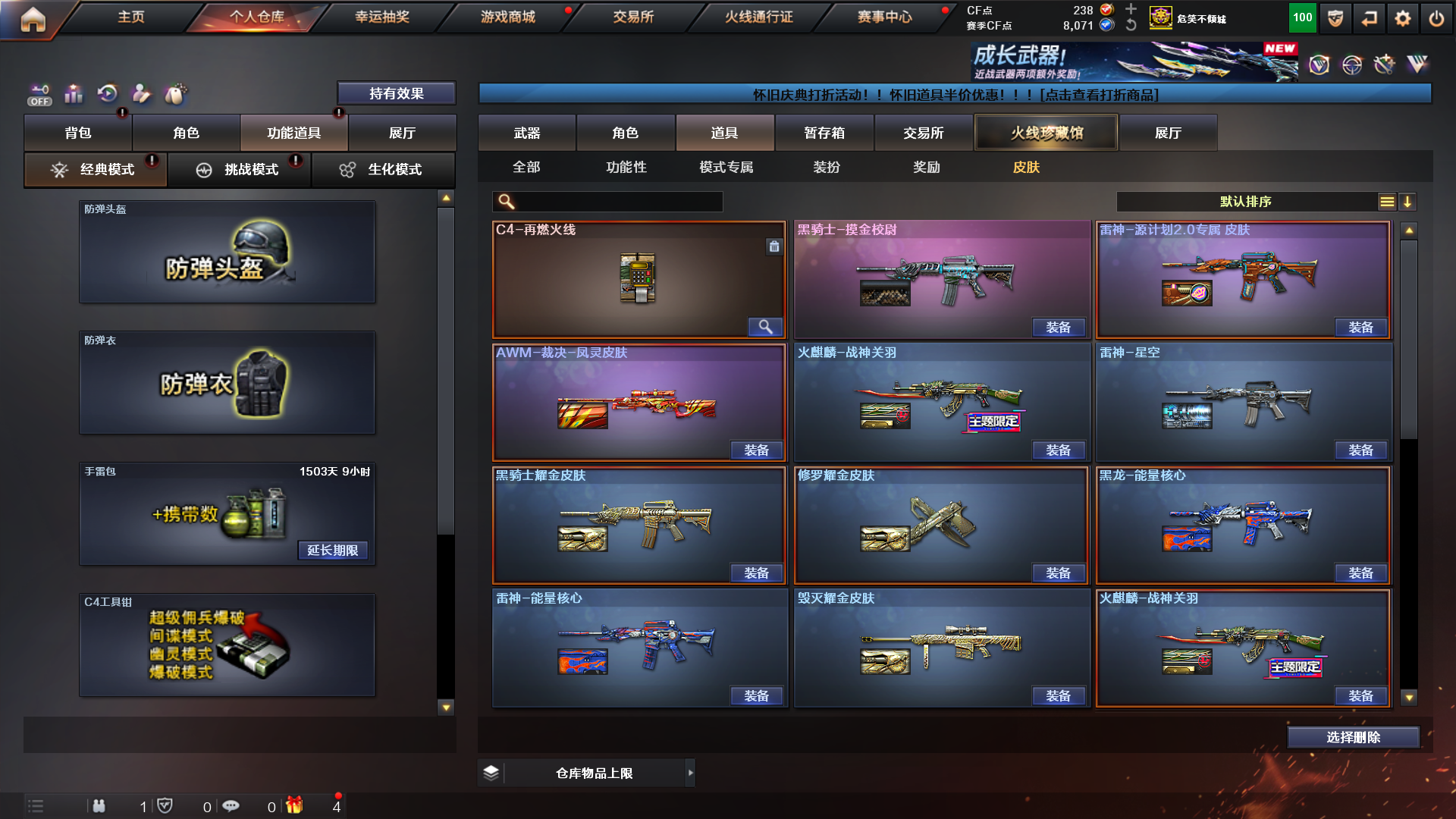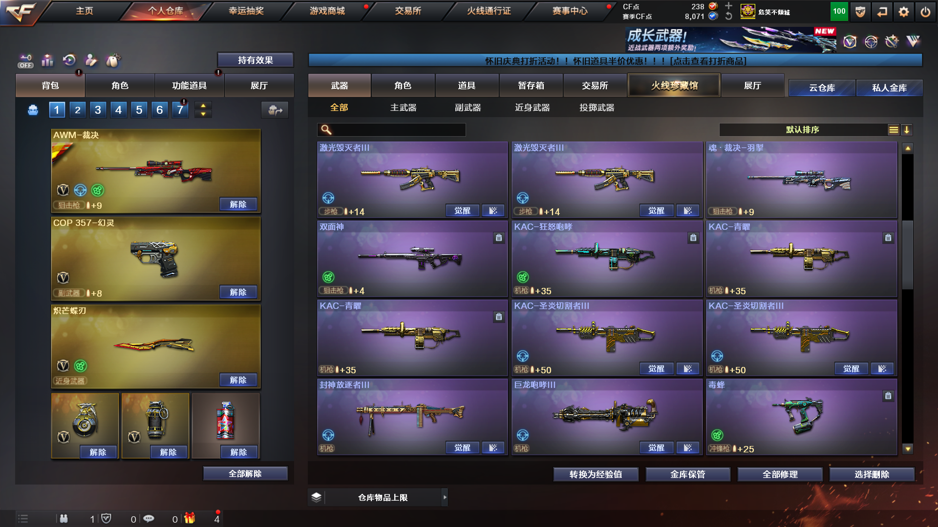 编号W203号|183V|上海一区|昵称:危笑不倾城(VIP5) 本号装备更新于:2025年2月3日 【皮肤】:毁灭-战神张飞(首发皮肤)、M200-幻神黄忠皮肤(首发)、M4A1-千变-孔明皮肤、火麒麟-战神关羽(首发)x3、黑骑士耀金、毁灭耀金x2、修罗耀金、火麒麟轻羽、无影霓裳、雷神虎将、雷神-星空、火麒麟-CFSTARx2、修罗-CFSTAR、黑龙-能量核心、雷神-能量核心、毁灭-黑大圣皮肤x2、火麒麟-平天大圣x2、 【角色】:沙漠玫瑰、春、炫、晴雅、传说艾莉莎、葵、樱、秦师、代号:翼、樱-青春偶像、铁扇公主、女战神、麻雀、剑齿虎-X、斯沃特-X、波特博士、女主播、王者-瞳-闭月羞花、超能特工、风暴女、木兰、斯沃特-X、剑齿虎-X、麻雀、女战神、樱-缤纷夏日、铁骑荣耀、夜玫瑰、雷霆-α、毒蝎、雅典娜、堕天使、兰、铁骑荣耀、G.E.M.邓紫棋、青霞仙子、沃特X、乔伊教练、精英部队、零-水下丽影、虚空、金戈、猎狐者-X、新斯沃特、铁骑、精英部队、奥摩、 【王者】:王者之影-觉醒版、炼狱-悦蓝-觉醒版、白虎之魄-觉醒版、炫金骑士、炫金雷神、迷你深渊冰龙(迷你近身)x2、斯泰尔蝴蝶(生化迷你)、M4A1-雷神-精英刀锋、COP-旗袍x2、夺魂、裁决-雪莉杨、 【主武】:天神-动感闪耀、烈火-动感闪耀、M14EBR-玄武、传说夜影x2、毒蜂(生化利器)、M4A1-幻灵(首发)、Barrett-电竞装甲(周年套)、异变清道夫(首发)、Kar98K-星神(首发)、Scar Light-白虎(首发)、毁灭征服者-超越Max(征服者觉醒)、征服者-寒冰之狱 [Lv Max]、征服者-超越1x6、烈龙x4、盘龙x7、加特林炼狱x4、死亡之眼x2、M200-幻神、Barrett-朱雀、HK417-朱雀(首发)、M4A1-青龙(首发)、AK47-雷暴、QBZ03-金色蔷薇、毁灭x2、天龙、裁决x3、极光x2、雷神、黑龙、火麒麟、黑骑士x5、黑武士、无影、死神x2、千变、玫瑰精灵、龙血、猎神、超新星、黑骑士-海王、御·雷神-小白龙、雷神-赛博朋克、机甲撕裂者III、KAC-圣炎切割者IIIx2、天蝎座x3、9A91-赤血龙魂、EVO III-赤血龙魂、激光毁灭者IIIx7、巨龙咆哮Ⅲ、神圣爆裂者-末日III、AK47-冰龙粉碎者、M4A1-十二生肖·龙-雷神、神圣爆裂者IIIx2、M200-赤血龙魂x3、M4A1-战龙、98K-黑金、98K-冰雪霸主x4、破天狂龙、黄金M249、黄金AK-47、AK47万圣节、斯太尔-封神、御·炼狱-女娲、 【副武】:COP-幻灵、柯尔特-电竞装甲(周年套)、破空枪刃-夜魔(首发年套)、修罗x4、沙鹰-天神、USP-雷暴、COP-堕天神、COP-小白龙、阐释者、MAC-10-涂鸦x2、麦特左轮-黑金神龙、迷你手枪、COP-二次元x2、COP357x2、M66-翔龙、 【近身】:屠龙-动感闪耀、无影-神兵利器、炽芒蝶刃、金刚伞(全新)、屠龙、猫猫手套、擎天、麒麟刺x4、斩神刀-雷暴、轻型军用手斧-镜x4、唐刀-九五至尊、凤凰之锋、丛林匕首-蓝色骑士、雷神之怒(大锤)、太极扇、金砖、手斧-n1ce冯永强x2、军用铁锹-飞龙在天、黄金炒锅、双龙x2、破天斩魔剑、 【投掷】:手雷-动感闪耀、烟雾弹-幻灵x3、高爆手雷-幻灵x4、闪光弹-幻灵x3、恶棍-电竞装甲(周年套)x8、烟雾弹-电竞装甲(周年套)x7、闪光弹-电竞装甲(周年套)x7、烟雾弹-雷暴x7、闪光弹-雷暴x7、高爆手雷-雷暴x7、迷你生化手雷x3、高爆手雷-雷蛇、凤凰之息x3、闪光弹-网把、玫瑰手雷、 【光效】:M4A1-黑骑士紫橙光效、M4A1-黑骑士蓝色光效x3、修罗蓝色光效x2、炼狱蓝色光效、 【玩偶】:熬丙玩偶、黄金幸运猪猪玩偶、战舰玩偶、电磁巨兽玩偶、王者刀锋玩偶、王胖子玩偶、孙尚香玩偶、红色艾比玩偶x2、地狱终结者玩偶x2、牛魔王玩偶-无情烈焰x4、 【道具】:白虎音效卡、AWM-裁决音效卡、黑骑士音效卡、超级对讲机(加10%子弹)、超级背包、生化弹匣x2、炫彩背包、夺命之镰、防化服、迷雾幽灵、灵魂忍者(矮子)、变异宝贝x2、绿色巨人x2、妖姬、生化弹匣(7天20小时)、步枪弹匣(1226天22小时)、步枪弹匣(1226天22小时)、散弹枪弹匣(575天22小时)、机枪弹匣(67天22小时)、勇往直前不退包(7天20小时)、7个背包;USP-雷暴,炽芒蝶刃,沙漠玫瑰,晴雅,传说艾莉莎,RPK-盘龙,QBZ03-金色蔷薇,