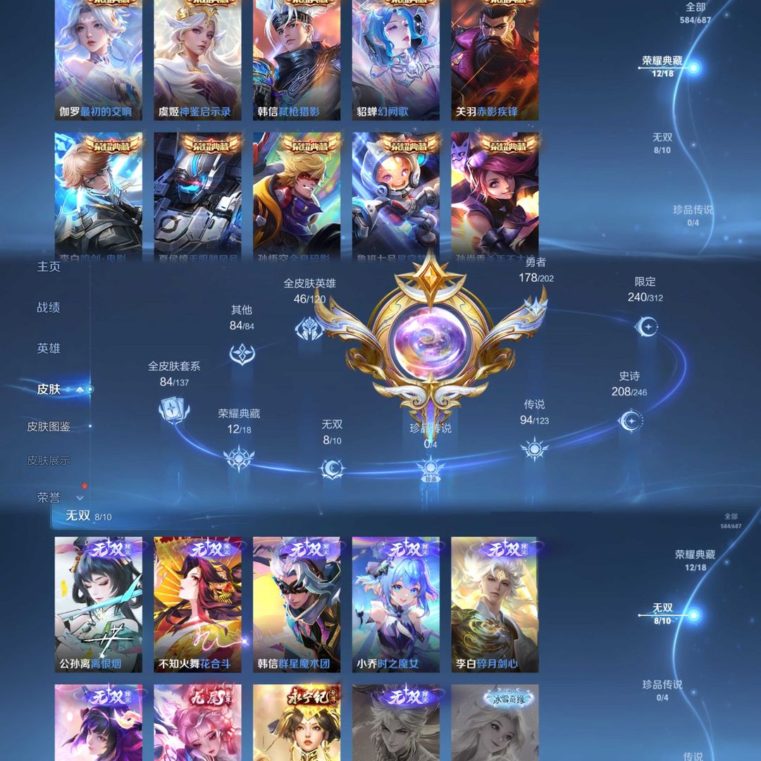 无双贵族十584皮/94传说/13典藏/8无双/有戳/天幕/三蛇限/无双瑶妲己小乔/白虎志梅西至尊宝