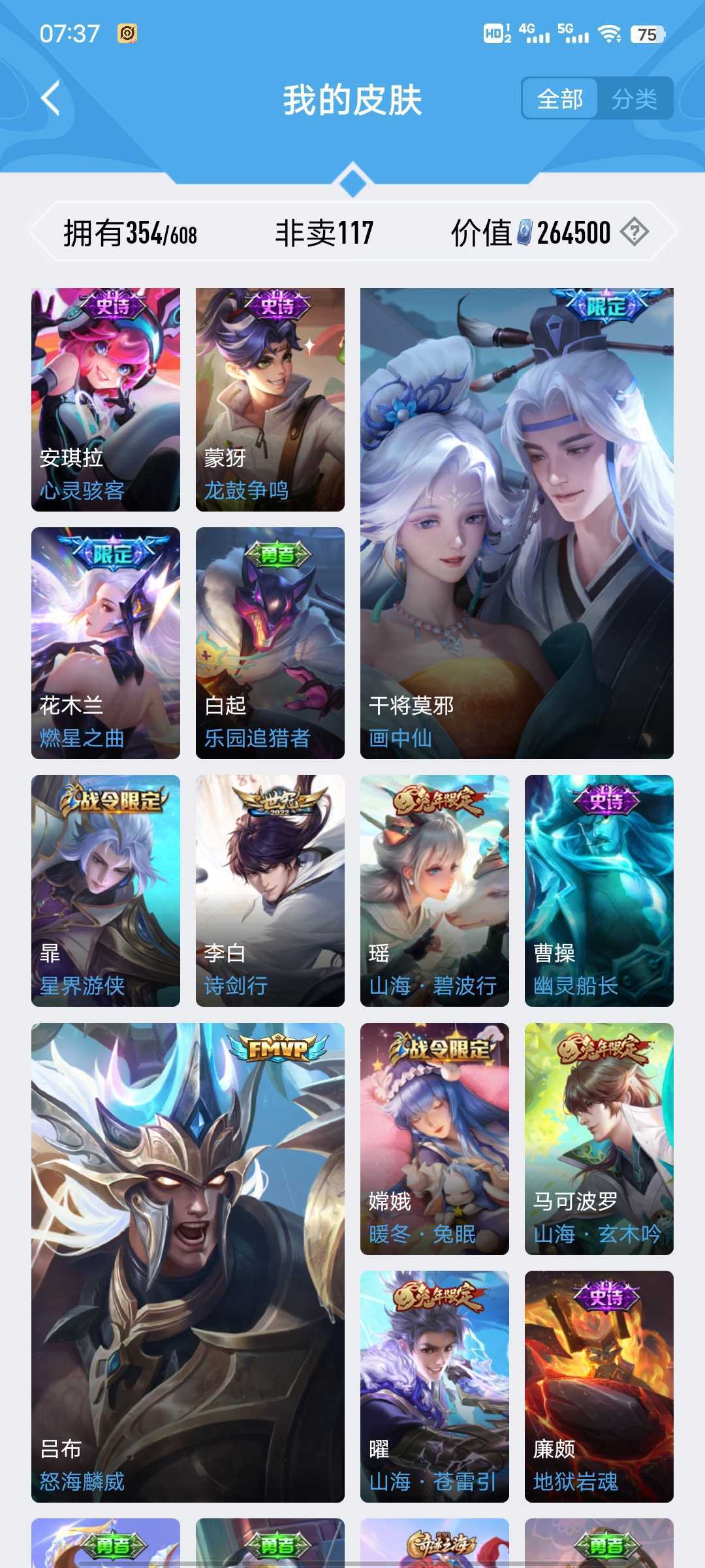 【非云直上】V10★皮肤榜一★539皮满典藏★鲁班时之奇旅会员★虞姬黛羽霜翎星元★吕布白金战神★全能大师★多金标★个性按键