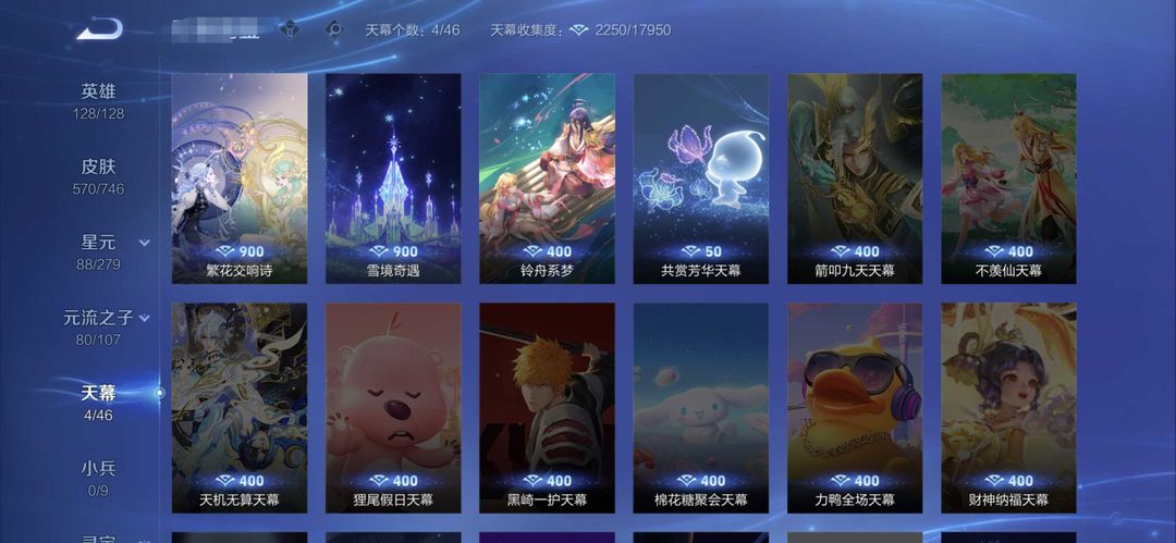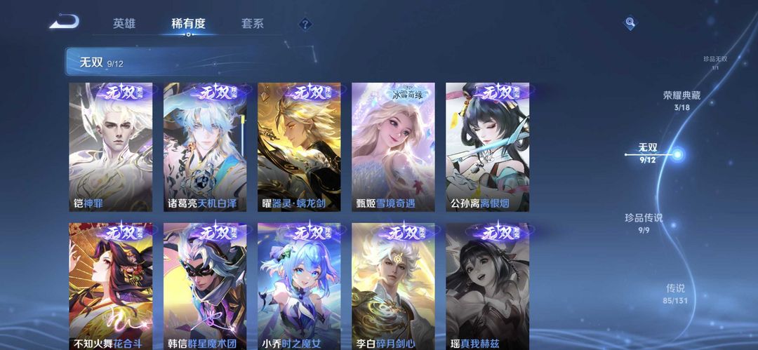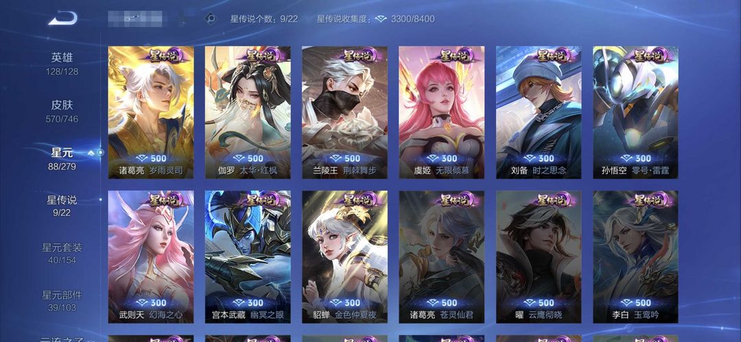 v10、509皮、刘备星传说时之思念、韩信荣耀典藏、瑶珍品传说大耳狗之梦、青丘·九尾、星域神启、画中仙、深海之息、天魔缭乱