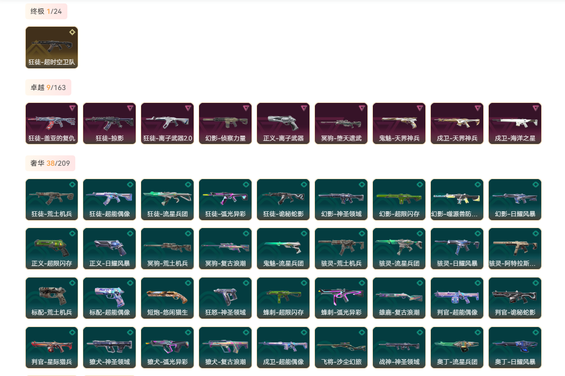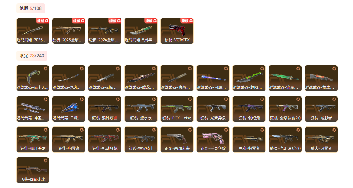 wegame无畏契约★刀皮数量13,枪皮数量151(绝版5限定33终极1卓越9);皮肤资产价值67260,【刀皮】:近战武器-2025全球冠军赛蝴蝶刀,近战武器-5周年公测重制版苍龙之刃,近战武器-显卡3.0爪刀,标配-VCTxFPX,狂徒-2025全球冠军赛,幻影-2024全球冠军赛,正义-千灵华绽,正义-西部未来,骇灵-光明哨兵2.0,狂徒-全息波普2.0,狂徒-塑水宗,狂徒-机动狂飙,狂徒-归零者