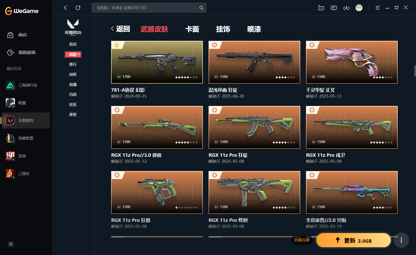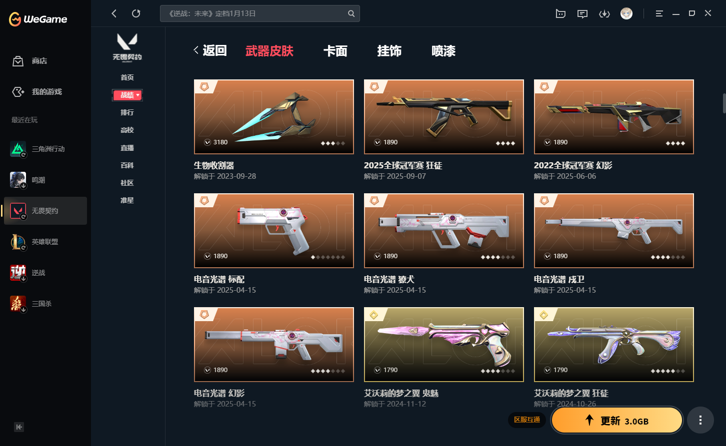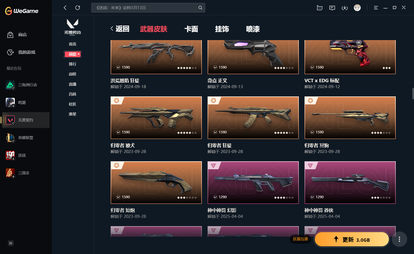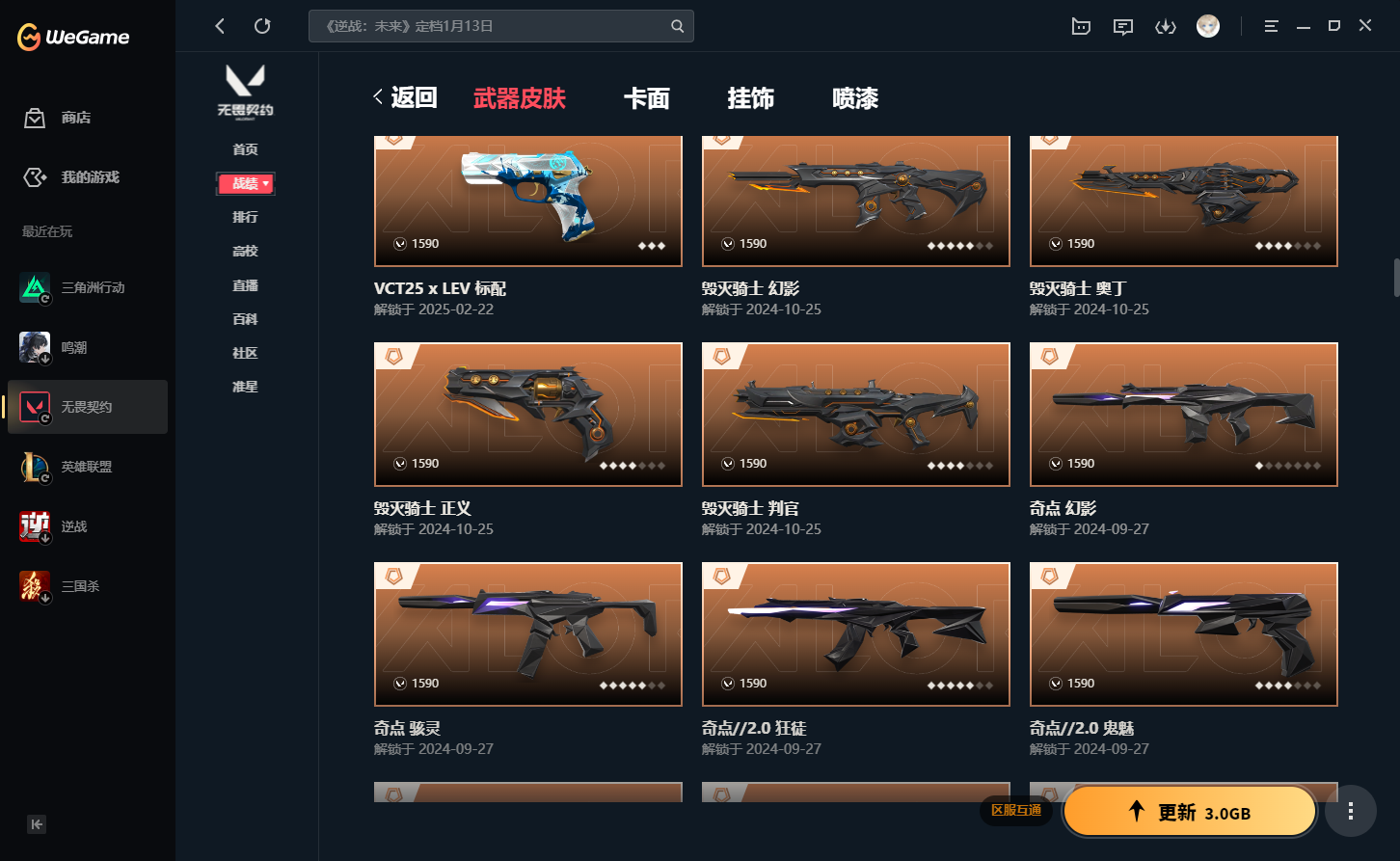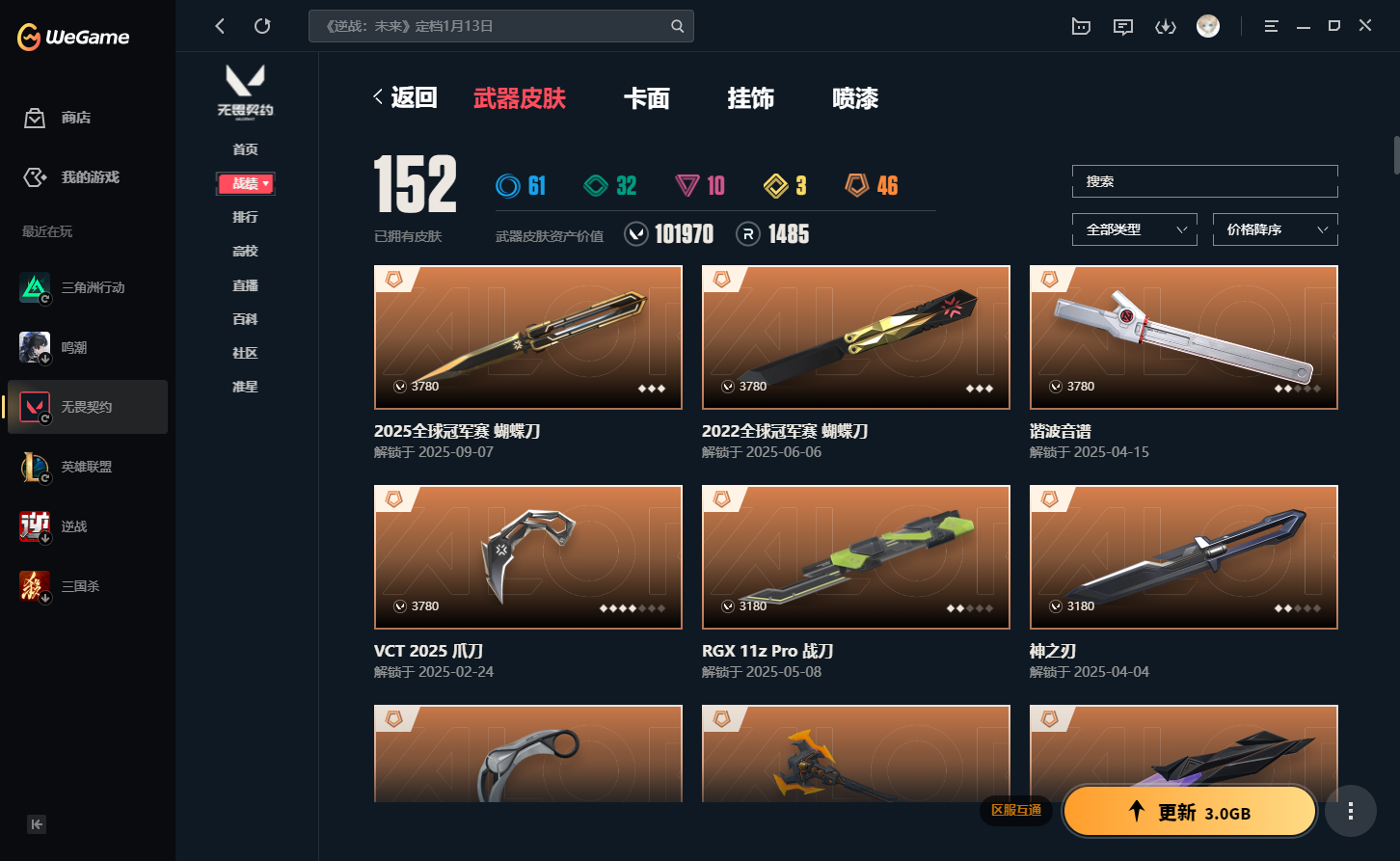 wegame无畏契约★皮肤数量152 2025冠军蝴蝶刀 VCT爪刀 神之刃 生物收割器 电音光谱套装 RGX套装 毁灭骑士套装 奇点套装 归零者套装 神罚套装 离子武器套装 星际猎兵