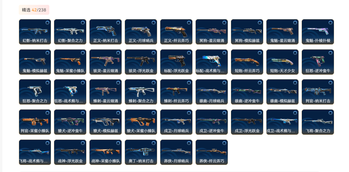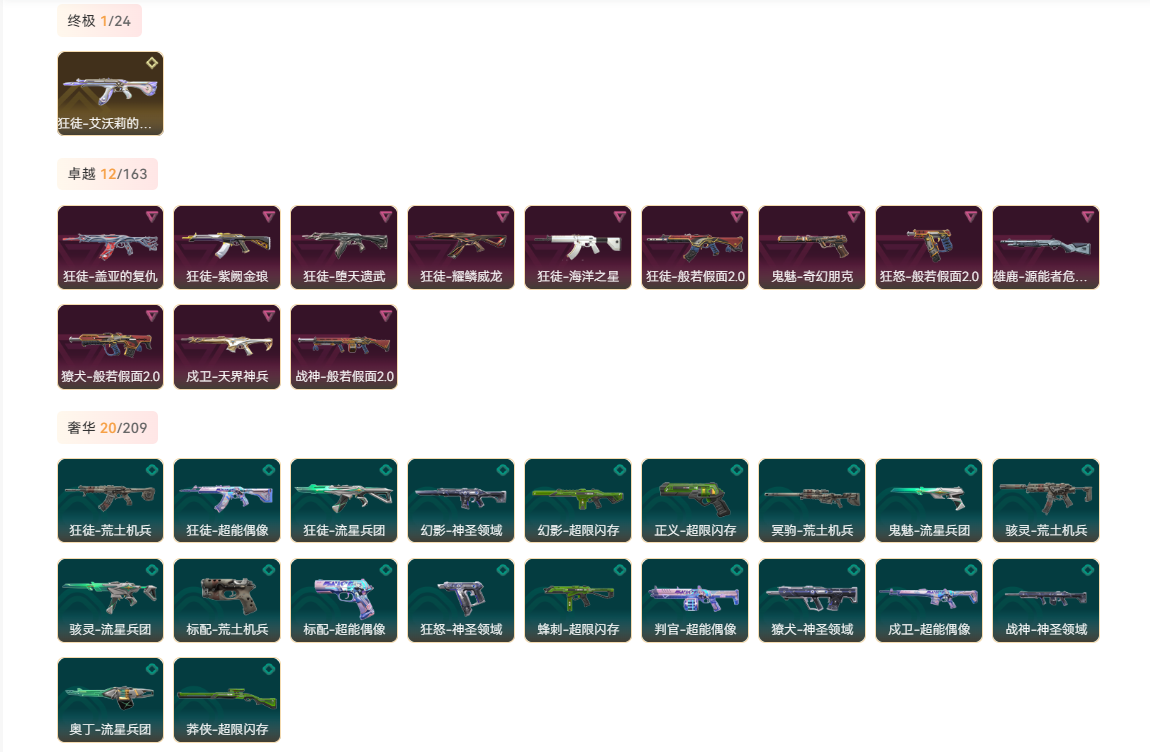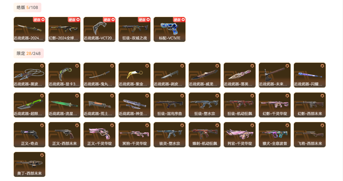 wegame无畏契约★ 刀皮数量15,枪皮数量93(限定33究极1尊爵12);近战武器-2024全球冠军赛战刀,近战武器-显卡3.0爪刀,近战武器-闪耀之星荧光棒,近战武器-鬼丸国纲,正义-千灵华绽,正义-西部未来,骇灵-塑水宗,蜂刺-机动狂飙,判官-千灵华绽,狂徒-塑水宗,狂徒-机动狂飙,狂徒-双城之战,狂徒-混沌序曲,幻影-2024全球冠军赛,幻影-千灵华绽