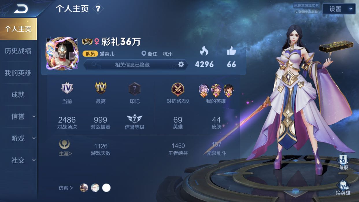 没有禁言,可以加好友V10!双王者之证!九荣耀水晶!五星元!380皮肤,武则天神域,李白荣耀典藏,诸葛亮荣耀典藏