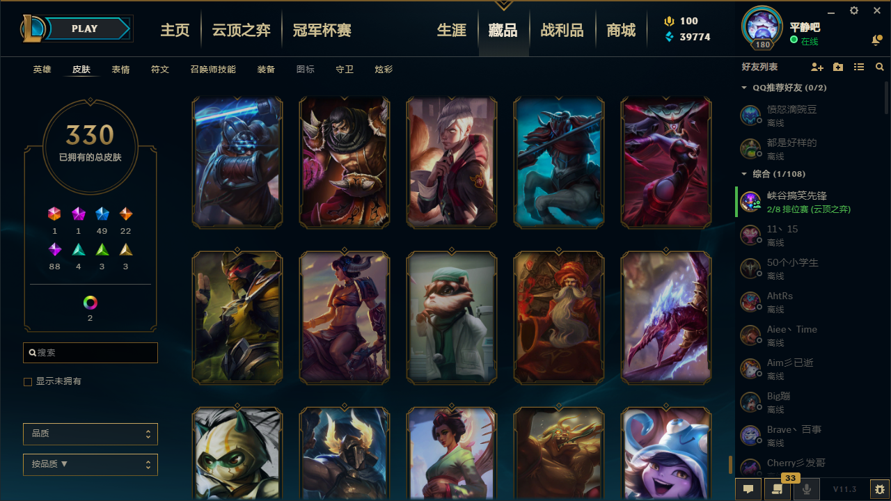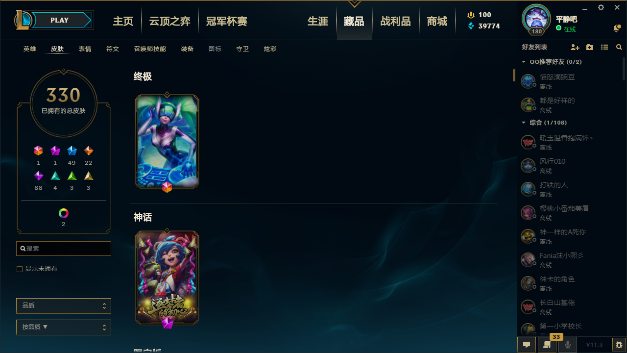 真实1840P/可排位/最新至臻亚索/43个至臻(卡特+女枪等)/龙瞎+龙猴+龙刀+龙琴/先驱者瑞兹/fpx冠军套/ig冠军套/超多年限/满情人节皮/