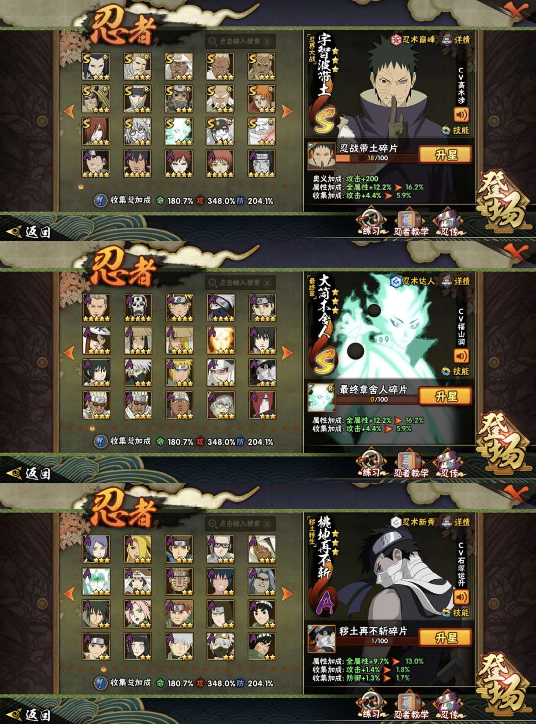 租号搜空导💥365忍 全51S 2850万战 准全通灵《新S须佐卡卡西💥须佐止水》漂泊武士天道 扉间/再不斩💥暴怒带土 疾风咒佐 恶灵飞段 全新春忍者 面麻 百机蝎 空导 喜欢记得收藏!请勿毁号和乱发广告!