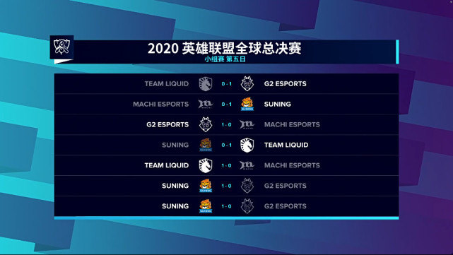 10月8日晚, 2020英雄联盟全球总决赛A组最后一场小组赛结束,苏宁易购旗下电子竞技俱乐部SN战队击败G2战队,最终成绩为5胜2负,并以A组第一名的身份出线,成为了第一支晋级八强的LPL(中国大陆赛区)战队。北京时间10月8日,2020英雄联盟全球总决赛小组赛,A组出线名额确定。SN加赛完成对G2的“双杀”,A组第一成功晋级八强,G2以小组第二出线。TL和MCX止步十六强。