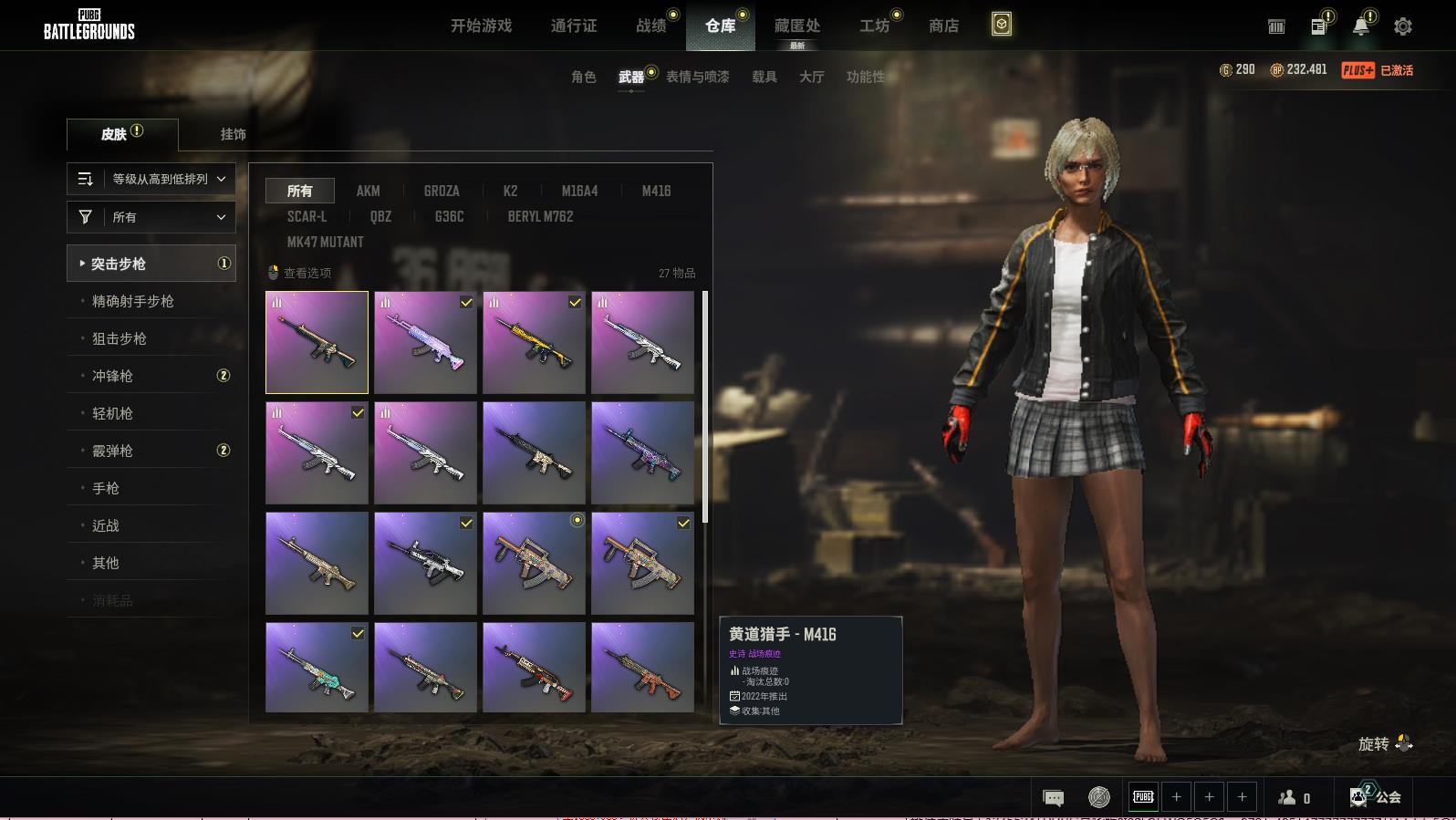 二级密码389389 PUBG豪华版,随机2-4级生存等级,黄道猎手-M416;危险玩偶屋-BERYLM762;小兔巡逻队-M416;君临寒冬-AKM;猛虎猎手-SLR;黄道猎
