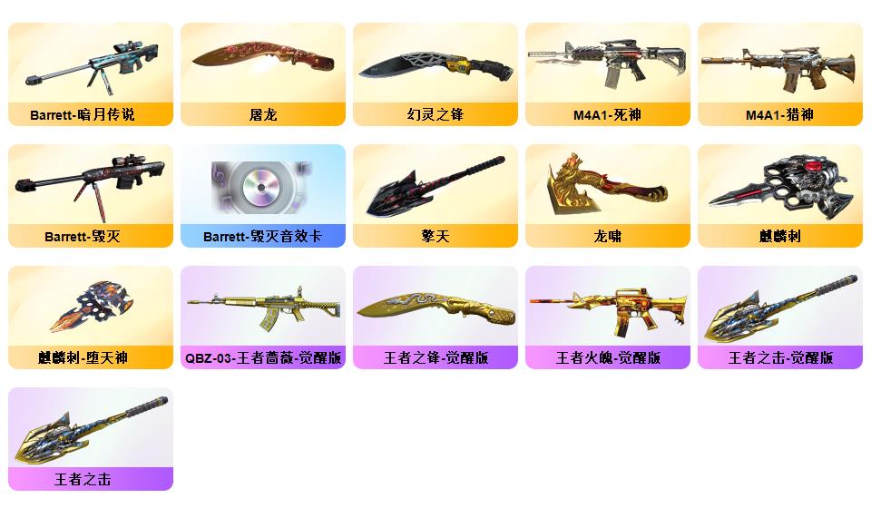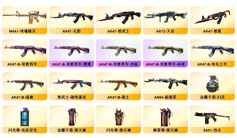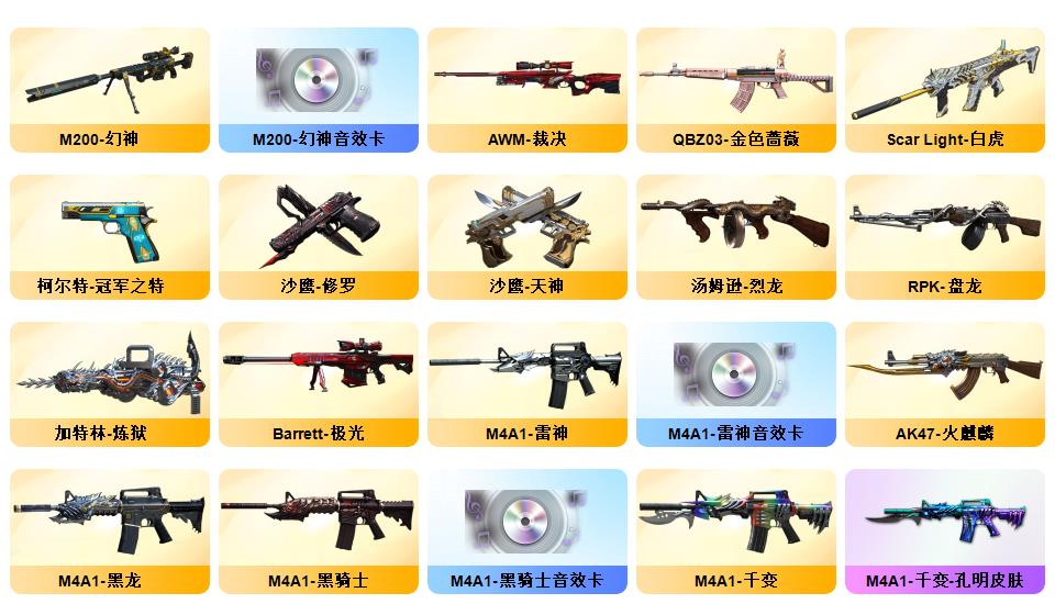 幻神(周瑜+音效卡)+白虎+QBZ+柯尔特-冠军之特*1+冠军之刃*1+2盘龙+3炼狱+6烈龙+斯泰尔-蝴蝶+沙鹰-修罗*4+1套雷+王者-春+音效卡(雷神+毁灭+黑骑士)