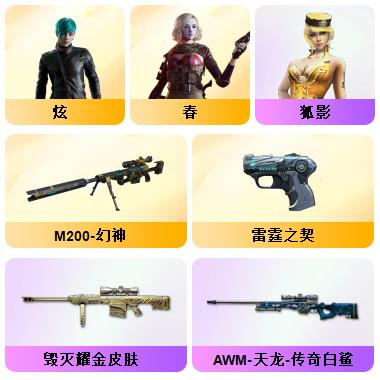 100V幻神荣光套/电竞云悠悠/惊若翩鸿/蛇隐宗/QBZ蔷薇套/毁灭音效+星空耀金青帝/极光音效/雷神星空/AG火麒麟/雷暴USP/六修罗/王者冰魄/开挂必起诉