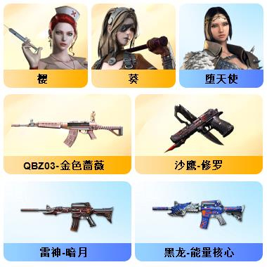 100V星神/六烈龙/生化无需换弹/QBZ蔷薇/白鲨COP/王者春/毁灭音效+雷神音效+极光音效/毁灭耀金/雷神白鲨耀金/火麒麟EVEN+华夏之心+轻羽AG皮肤