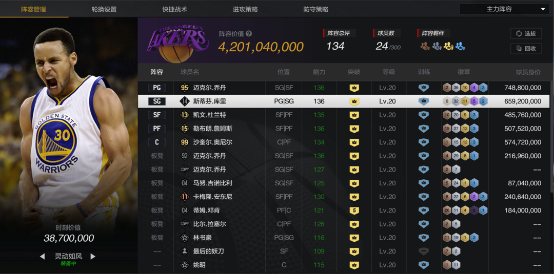 满突破满特训,14库里,99奥尼尔,95乔丹,92乔丹,复刻乔丹,04吉诺比利,11安东尼,13杜兰特,15詹姆斯,复刻拉塞尔,+5邓肯。收藏球员姚明,林书豪,易建联,王治郅,李凯尔,复刻版本球星+4韦德,+4麦迪,+3詹姆斯,+3奥拉朱旺,