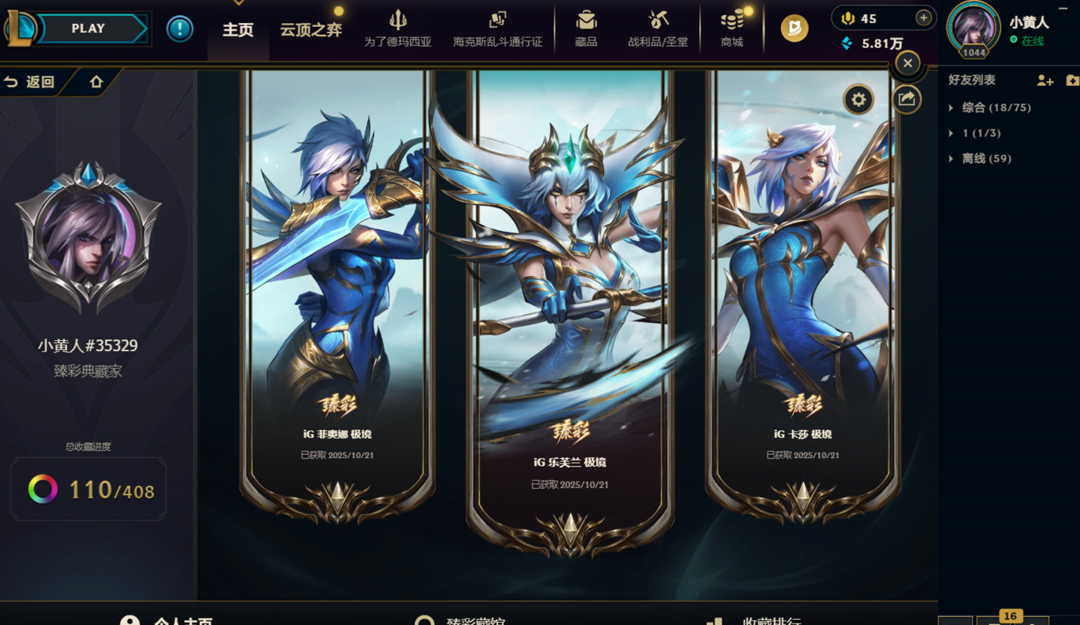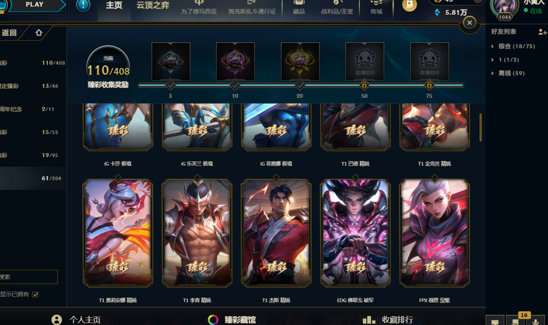 至臻卡莎、至臻奇亚娜、至臻女警、海克斯诺手、海克斯鳄鱼、钢铁拉克丝、克格汪、羊年金克丝、花木兰等优质皮肤