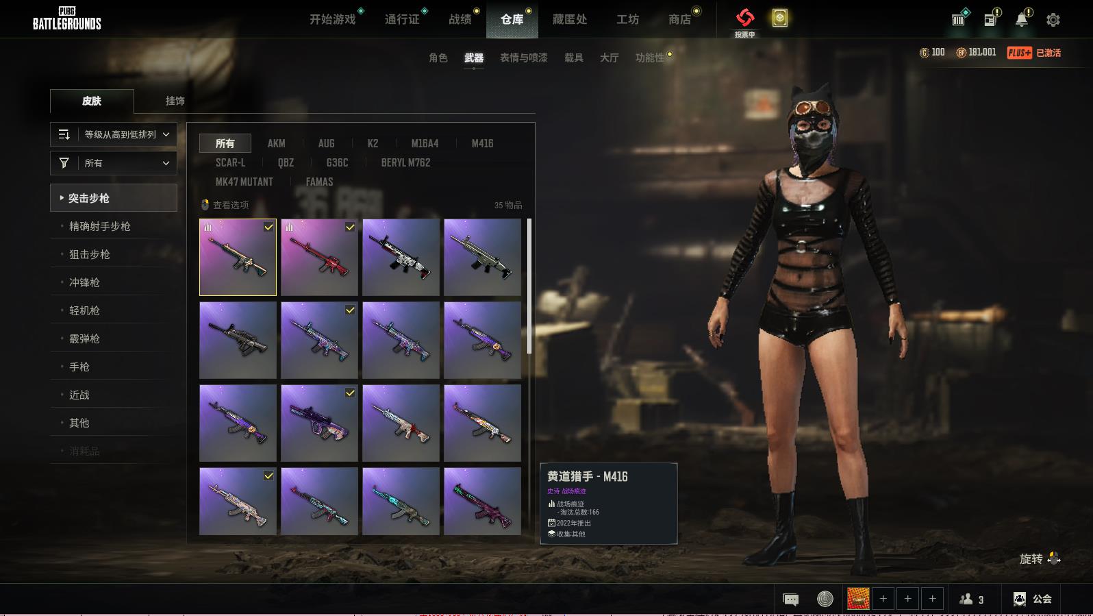 PUBG豪华版满级生存可排位,黄道猎手-M416;猩红时刻-M16A4;蒸汽计量表-KAR98K;三重彩-SCAR-L;镀银-SCAR-L;分秒必争-QBZ;疯