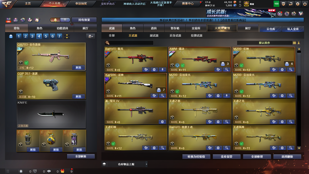 王者武器:烟雾弹-雷暴王者;闪光弹-雷暴王者;高爆手雷-雷暴王者;USP-雷暴王者;王者幻神-觉醒版;QBZ-03-王者蔷薇-觉醒版;Barrett-雷霆王者-觉醒版;COP 357-雷霆王者-觉醒版;雷霆王者之锋-觉醒版;超新星-悦享;炫金黑龙;烟雾弹-雷霆王者-觉醒版;高爆手雷-雷霆王者;闪光弹-雷霆王者-觉醒版;王者青龙;王者之怒-觉醒版;王者之击-觉醒版;王者之武-觉醒版;炫金毁灭;王者之锋-觉醒版;王者玉锋;王者之光-觉醒版;玫瑰精灵-悦动 英雄武器:Barrett-毁灭;烟雾弹-玄豹;Anaconda-玄豹;高爆手雷-玄豹;闪光弹-玄豹;传说圣谕;柯尔特-冠军之特;G36C-幻影;M200-幻神;传说辉光;AWM-裁决;Kar98K-星神;沙鹰-天神;Barrett-极光;M4A1-玫瑰精灵;AN94-超新星;RPK-盘龙;M4A1-死神;AK12-天启;QBZ03-金色蔷薇;闪光弹-云龙;高爆手雷-云龙;烟雾弹-云龙;黑武士-锦绣游龙;炽芒蝶刃;传说破晓;无影-神兵利器;闪光弹-神工天巧;传说夜影;AK47-机械迷城;AK47-火麒麟;闪光弹-竞技荣光;烟雾弹-竞技荣光;