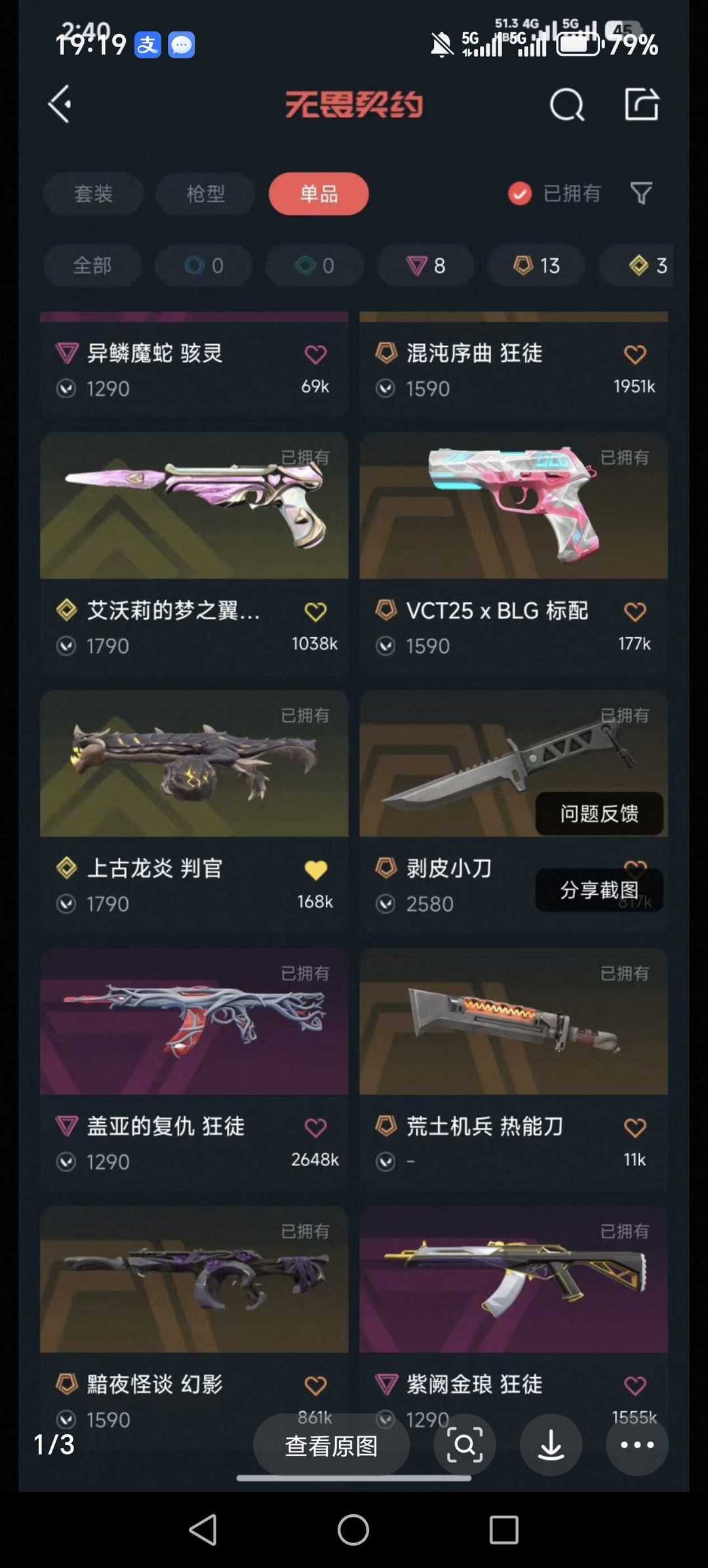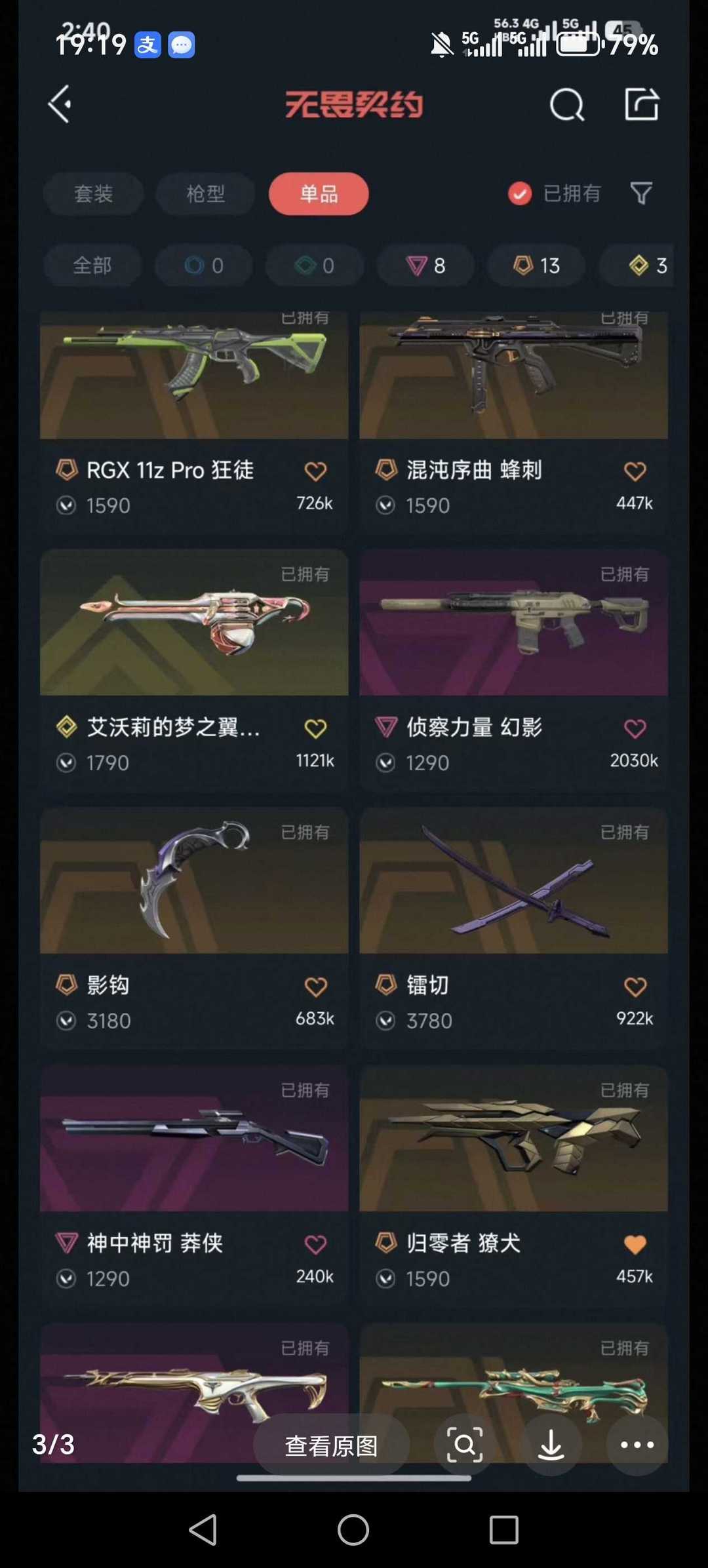 可排位+掠夺爪刀+剥皮+雷切+紫金狂徒+魔蛇幻影+边陲正义+混沌狂徒+盖亚狂徒