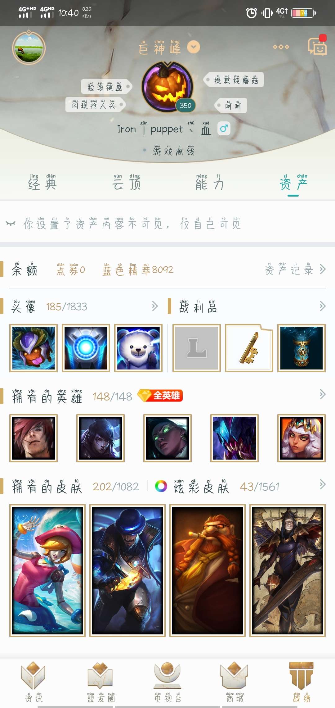 神峰全英雄 215皮肤可排位 灵能特工易 德莱文全皮肤FPX石头人 星之守护者厄加特 花木兰 嫦娥仙子 南瓜头末日
