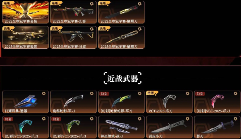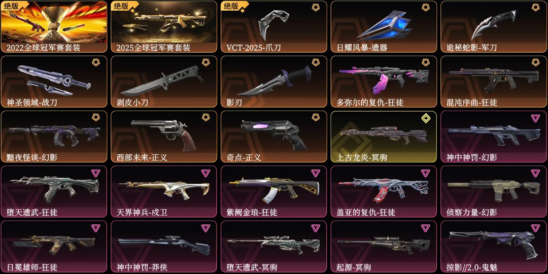 可排位大库存☆22.25全球套☆VCT爪刀☆混沌序曲☆盖亚☆多弥尔的复仇☆紫金☆侦查☆各种散件☆炫彩