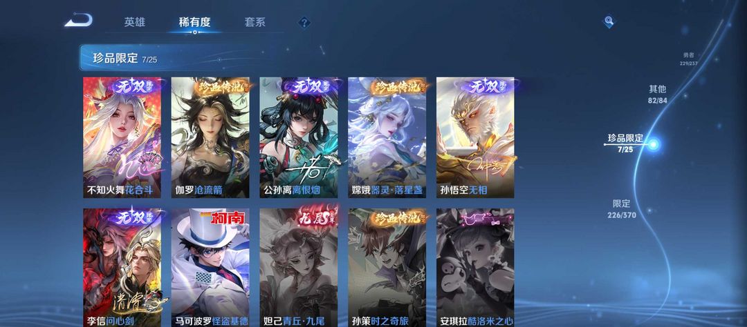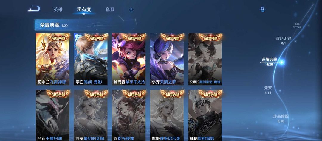 v10、537皮6水4无双、安琪拉-颠倒童话·魔镜、朵莉亚-神骥、遇见神鼓、齐天大圣、白虎志、韩信荣耀典藏、73传说、时之魔女、瑶无双、青丘、九尾、神器明辉仪