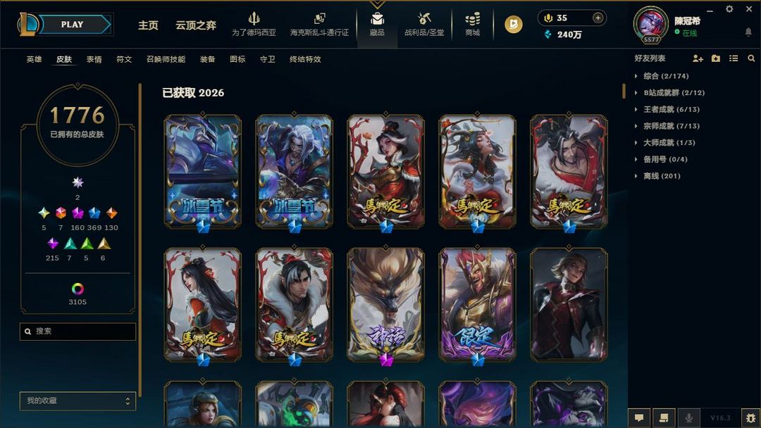 1776原皮❤️4000炫❤️名人堂卡莎阿狸❤️圣堂佛耶戈❤️圣堂金克丝❤️圣堂腕豪❤️全套至臻神话