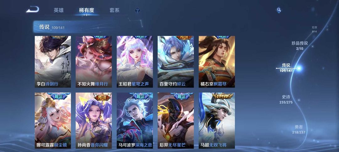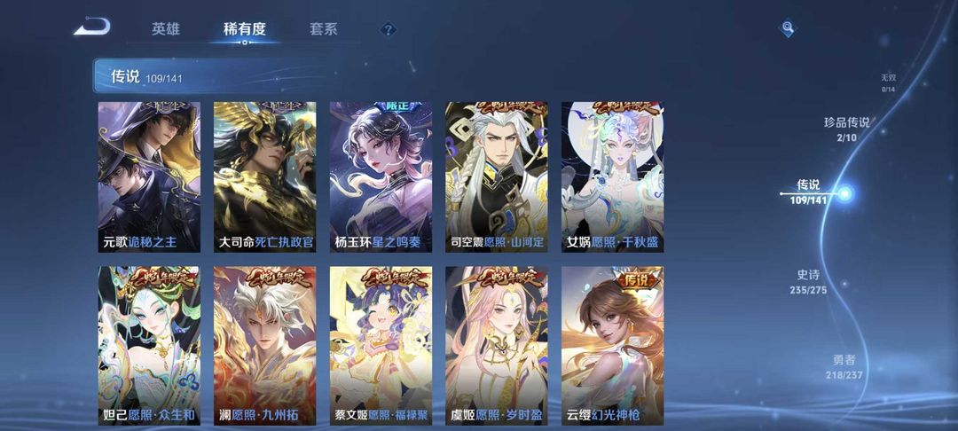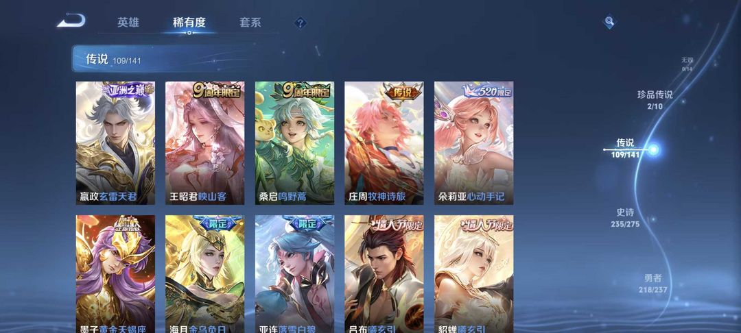 v10、537皮6水4无双、安琪拉-颠倒童话·魔镜、朵莉亚-神骥、遇见神鼓、齐天大圣、白虎志、韩信荣耀典藏、73传说、时之魔女、瑶无双、青丘、九尾、神器明辉仪
