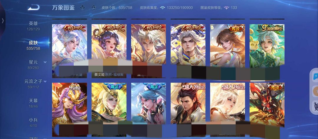 v10、12水555皮、死亡执政官、刘备星传说时之思念、小兵皮肤大耳狗甜茶、瑶无双真我赫兹、愿照·九州拓、怪盗基德、画中仙、至尊宝、凤求凰、神威、天魔缭乱