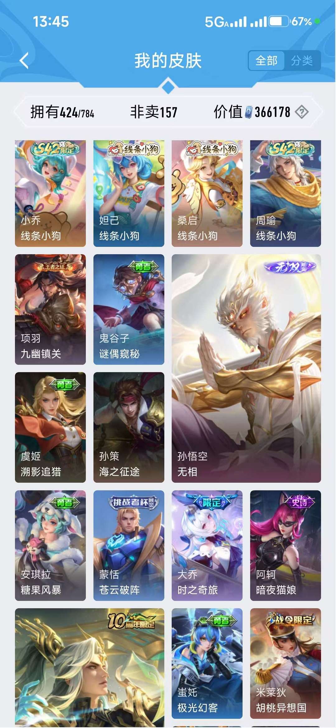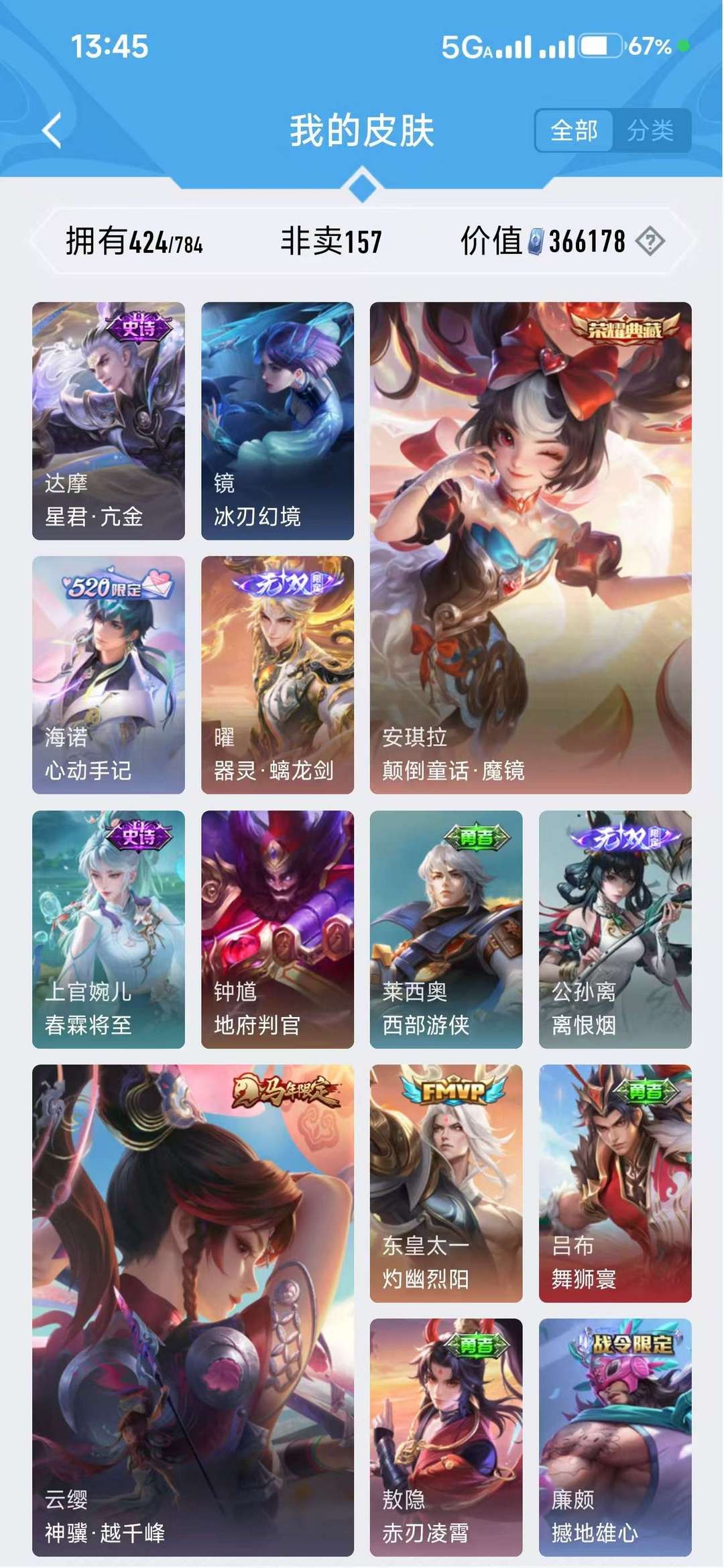 扫码登录。VIP10。385皮肤,七水,四星元,双王者之证!武则天神域,李白荣耀典藏,全息碎影,全符文,各种限定,各种机甲,皮肤都有,绝对满足各位