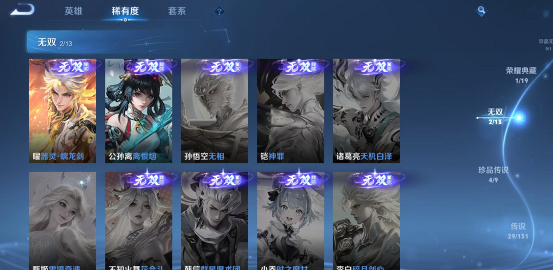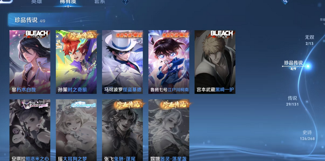 V10、543皮14水、吕布典藏-千魇归渊、愿照·九州拓、愿照·众生和、怪盗基德、伽罗星传说红枫、瑶典藏拾光映像、冥王哈迪斯、、龙年限定、齐天大圣