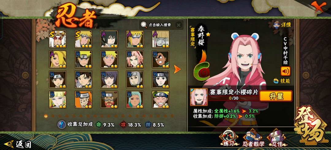 须佐佐助,清水,自来也,百战水门,鬼鲛,秽土转生迪达拉,中秋名人,秽土老紫,天天,春野樱赛事限定
