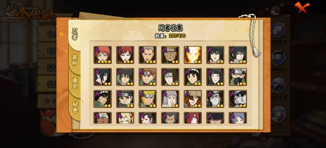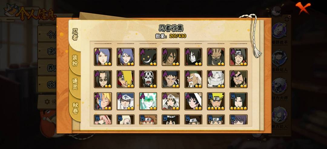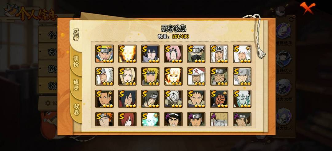 【漩涡鸣人 「九喇嘛连结」,千手柱间 「木叶创立」,大筒木舍人 「最终章」,宇智波带土 「十尾人柱力」,宇智波佐助 「永恒万花筒」,宇智波带土 「忍界大战」,自来也 「舞之豪杰」,“宇智波斑” 「白面具」,千手扉间 「秽土转生」,自来也 「传说中的三忍」,漩涡鸣人·宇智波佐助,波风水门,纲手,佩恩 「天道」,宇智波鼬 「须佐能乎」,猿飞日斩,猿飞日斩 「秽土转生」,长门 「秽土转生」,自来也,神秘面具男 「红夜之刃」,宇智波斑 「秽土转生·解」,春野樱 「忍界大战」,波风水门 「九喇嘛连结」,旗木卡卡西 「须佐能乎」】 A忍者:【佩恩·六道 「漂泊浪客」,桃地再不斩 「秽土转生」,大野木 「侠隐江湖」,照美冥 「侠隐江湖」,波风水门 「青年」,土台 「忍界大战」,迈特凯 「青春爆炸」,黑土 「四代目土影」,宇智波佐助 「须佐能乎」,宇智波泉奈,小南 「新春限定」,漩涡鸣人 「九尾查克拉」,千代 「近松十人卫」,宇智波鼬 「新春限定」,神农 「羁绊」,不动,巳月 「仙人模式」,不缘,日向雏田 「最终章」,长十郎 「六代目水影」,蝎 「绯流琥」,角都 「秽土转生」,黑土 「夏日限定」,机械