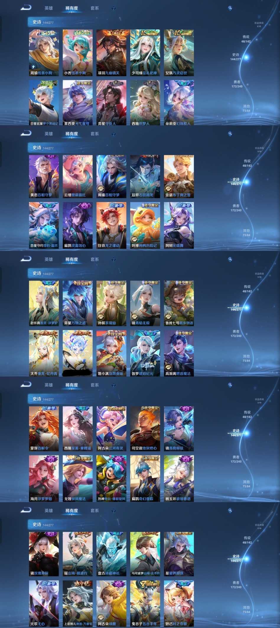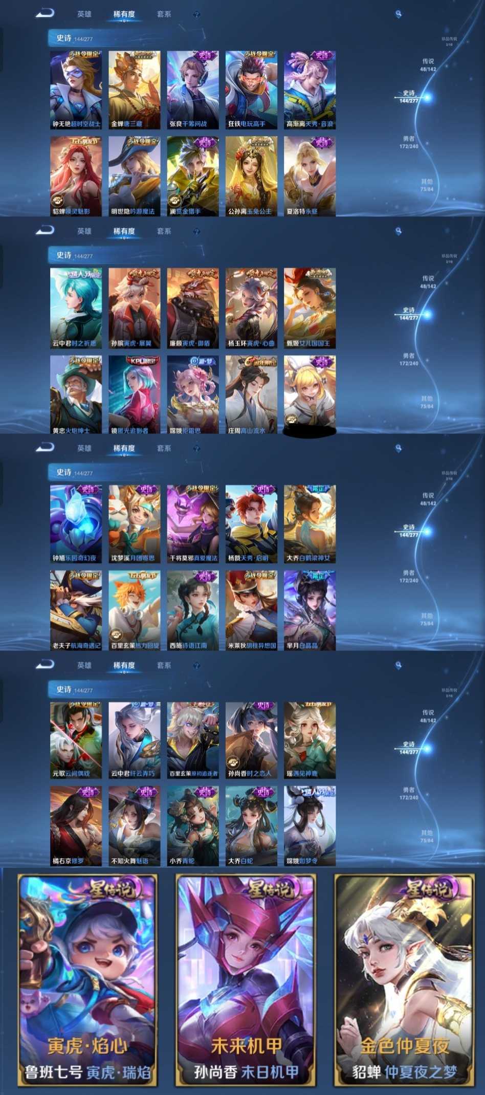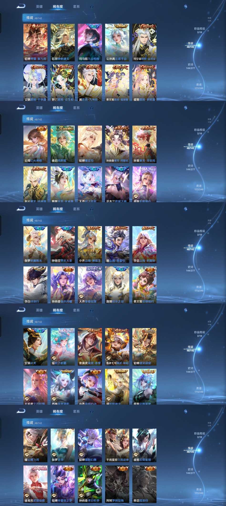 v10、537皮6水4无双、安琪拉-颠倒童话·魔镜、朵莉亚-神骥、遇见神鼓、齐天大圣、白虎志、韩信荣耀典藏、73传说、时之魔女、瑶无双、青丘、九尾、神器明辉仪