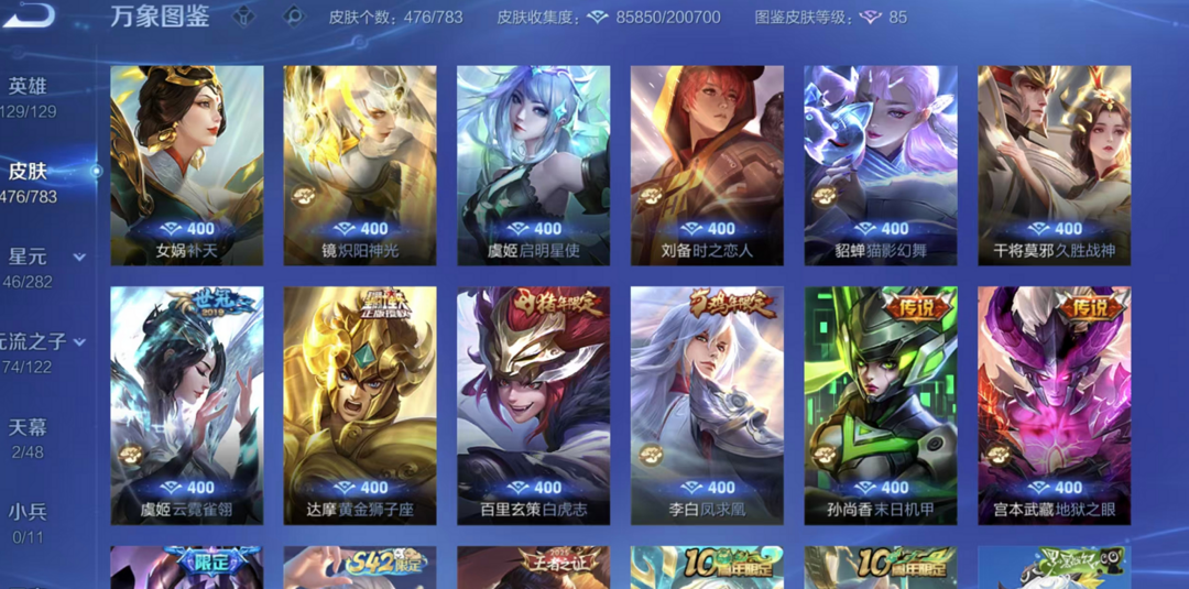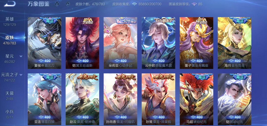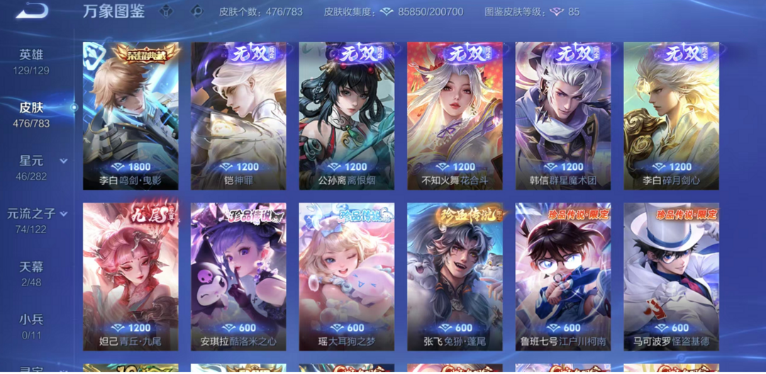 v10、12水562皮、死亡执政官、刘备星传说时之思念、小兵皮肤大耳狗甜茶、瑶无双真我赫兹、愿照·九州拓、怪盗基德、画中仙、至尊宝、凤求凰、神威、天魔缭乱