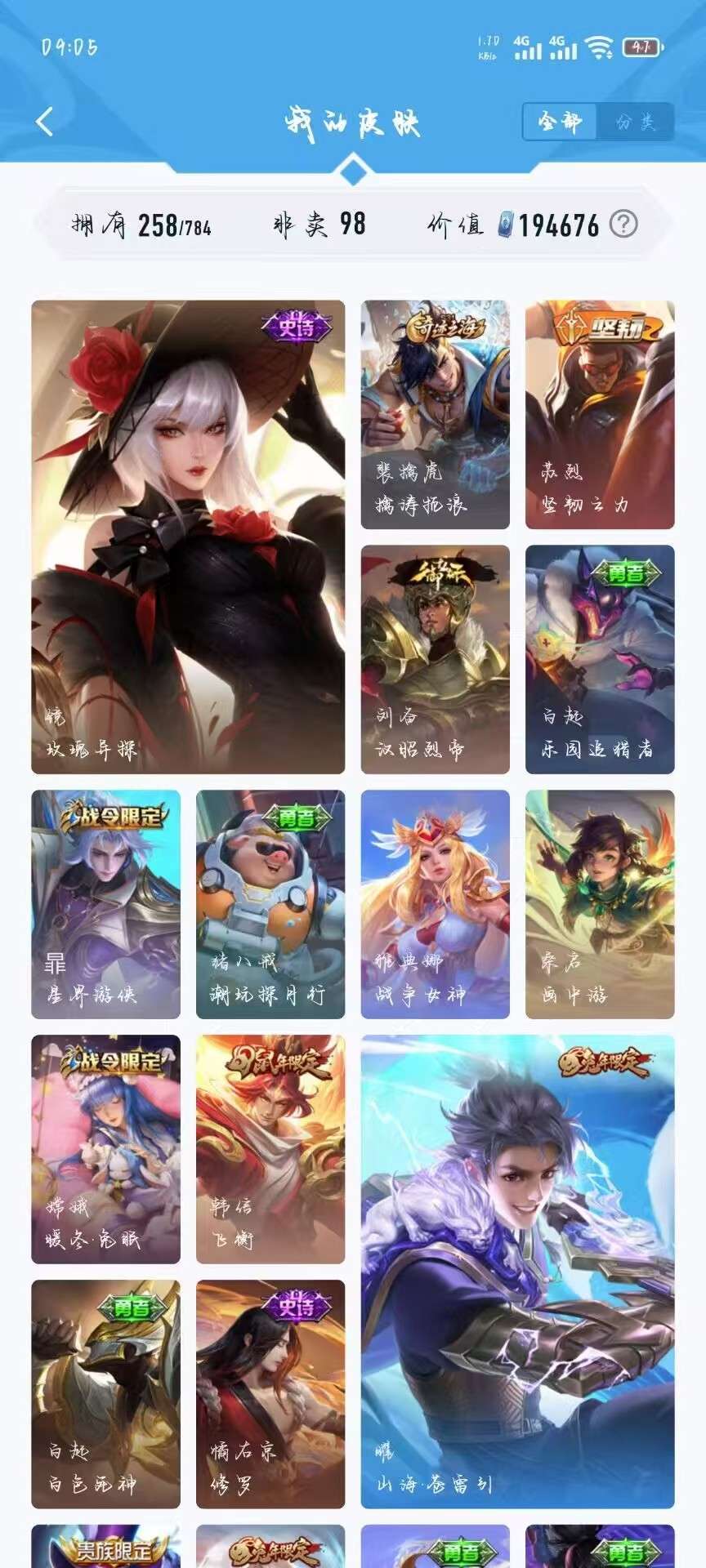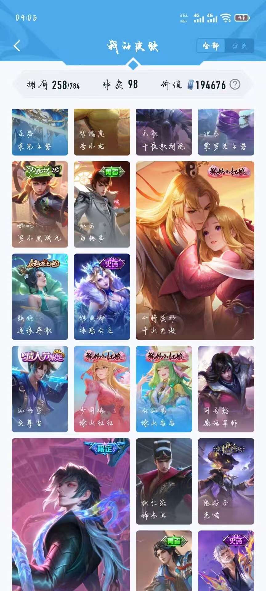 v10、537皮6水4无双、安琪拉-颠倒童话·魔镜、朵莉亚-神骥、遇见神鼓、齐天大圣、白虎志、韩信荣耀典藏、73传说、时之魔女、瑶无双、青丘、九尾、神器明辉仪