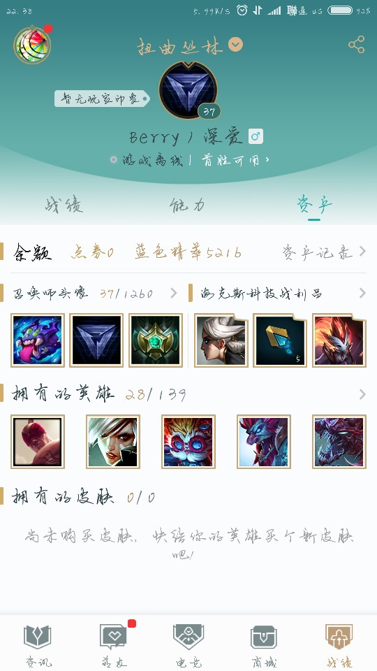 28常用英雄,可以双排。皮肤有男枪无情重炮胜利枪神,冰雪游神巴德,帝王斑蝶大嘴,银河魔装机神龙女,霓虹杀拳蔚,绞肉机德莱文,战场boos机器,黑桃皇牌EZ