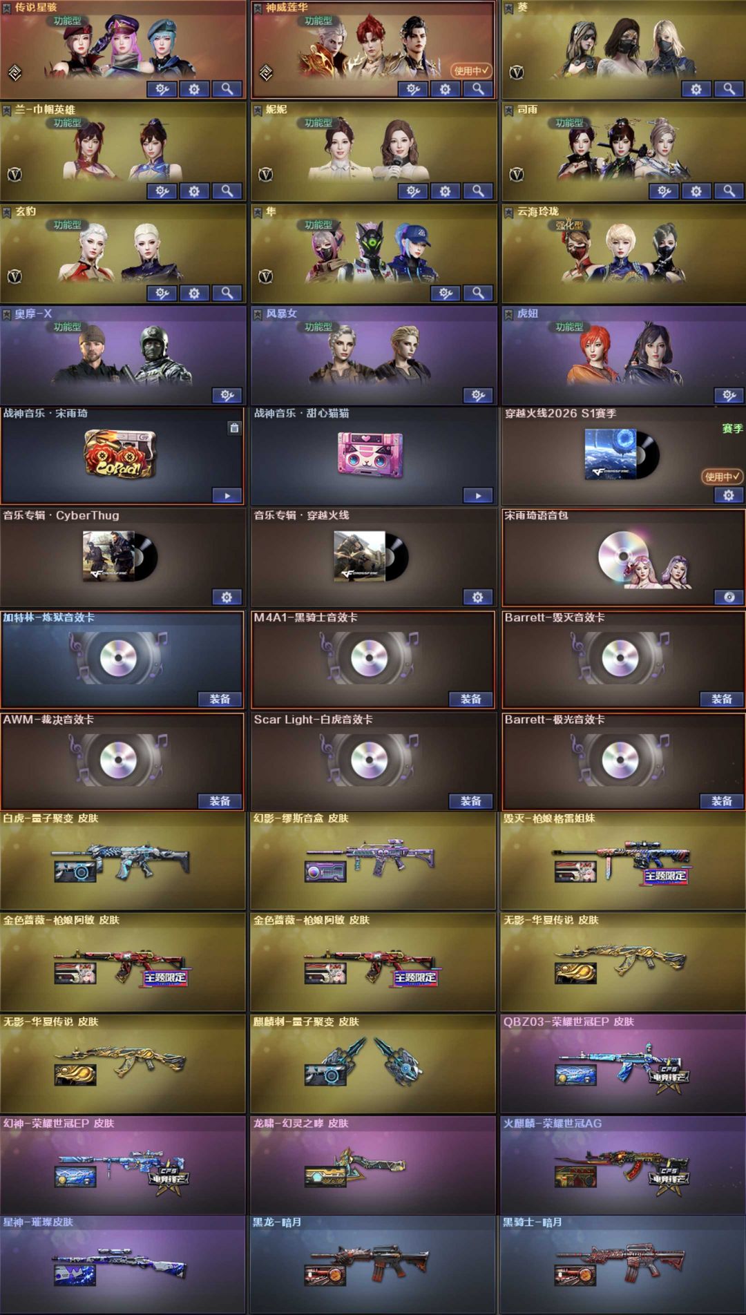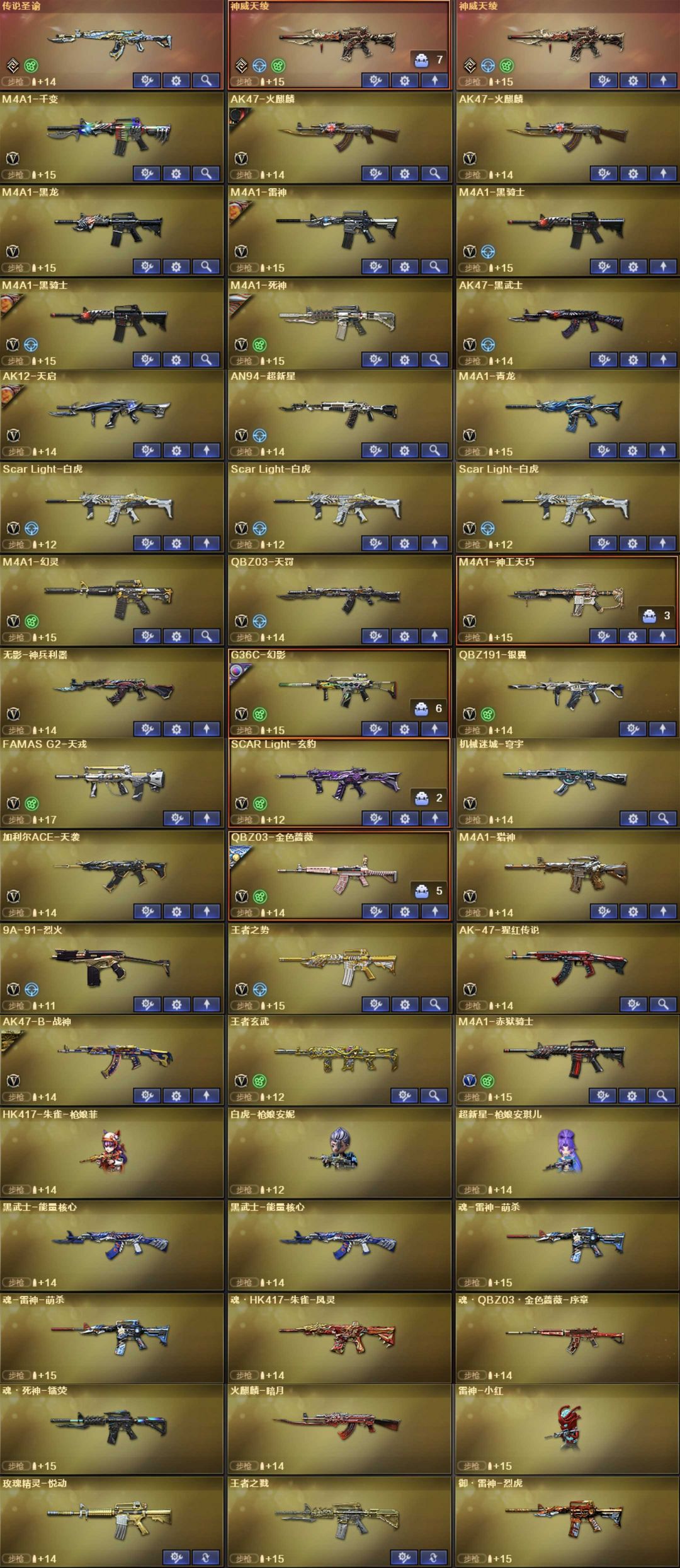 英雄武器53个; 王者武器5个。 可以玩爆破号、生化号、双全装、稀有武器、等模式,特殊装备有:柯尔特荣耀世冠白鲨2023、雷神、98K星神、AA12雷霆、加特林炼狱、麒麟刺、玄武、幻灵之锋、QBZ金色蔷薇、幻神、毁灭、黑武士、火麒麟暗月、高爆手雷雷霆王者、炼狱悦蓝觉醒、炼狱悦蓝、枪王之刃、源·武圣、魂·巴雷特蔷薇蛇姬、魂·QBZ蔷薇蛇姬、灵·QBZ蔷薇嘉年华、源·巴雷特朱雀、死亡之眼电子连击、AK-47-B、御·黑骑·哪吒闹海、御·黑武士烈虎、MK5SS、斯泰尔维纳斯、MP5SS、御·超新星圣诞、斯泰尔万圣节2020、M4A1玫瑰、AK47破空冰刃、斯泰尔正义、AK47青龙、斯泰尔-恶棍、死亡之眼、斯泰尔-巧克力、源·武圣glock、Colt1911宇航兔兔、柯尔特玫瑰、COP青龙、魅影、雷霆β、堕天使、圣诞潘多拉X、王者凌霄、生化弹匣、幻神音效卡