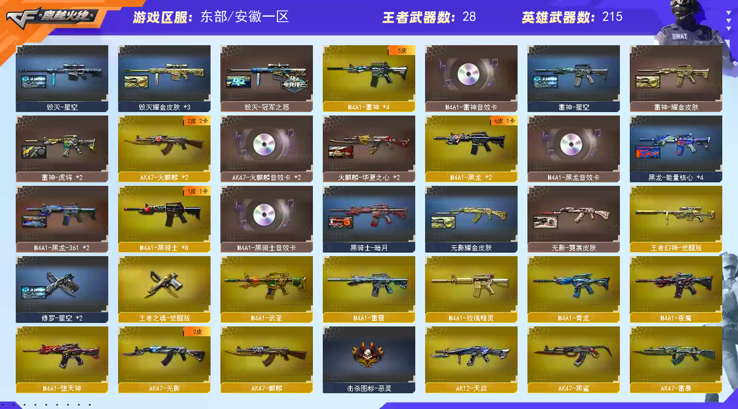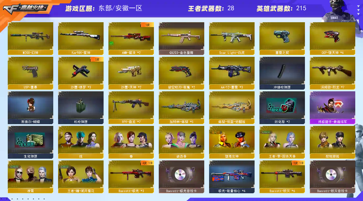 【主武器】M200-幻神/王者幻神觉醒/斯太尔蝴蝶/炼狱悦蓝觉醒/⑦烈龙/⑥盘龙/⑥炼狱/⑧黑骑士/白虎/朱雀/青龙/ak雷暴/m4夜魔/m4堕天神/M4雷霆/3火麒麟/2黑龙/4雷神/无影/死神/天启/超新星/武圣/黑鲨/黑武士/玫瑰精灵/蔷薇qbz/2烈火/王者之魄觉醒/王者之势觉醒/王者之武/黑武士网剧套装/王者冰魄/3天龙/6毁灭/3极光/2裁决/雷霆大炮/朱雀大炮/3蔷薇大炮/王者之光觉醒/暗月传说大炮/3aa12雷霆/雷神精英刀锋/火麒麟绝迹/火麒麟令狐/王者之心/王者之城/王者之幻/王者之戮/王者之心/王者之翼/王者之鲨/炫金骑士/2炫金武士/王者之力/王者之怒/炫金毁灭/暴君乱世超越6/CAT猫枪/金色小号/EVO赤血龙魂/MK5-SS秘银/M37葵/ 【副武器】COP357-雷霆/④COP堕天神/USP雷暴/②破空枪刃夜魔/3修罗/2天神/王者之魂觉醒/天神网剧套装/炫金修罗/炫金天神/COP旗袍 【近身武器】尼泊尔雷霆/马来剑夜魔/5屠龙/2龙啸/2擎天/4麒麟刺/斩神刀雷暴/麒麟刺堕天神/龙啸堕天神/幻灵之峰/王者之峰觉醒/擎天网剧套装/王者之刺/王者之啸/黄金迷你深渊冰龙/黄金生化钩/手斧镜 【投掷武器】②迷你生化手雷/⑦高爆雷霆+烟闪/⑦高爆雷暴+烟闪/⑦高爆堕天神+烟闪/⑦高爆夜魔+烟闪/高爆幻灵+烟闪/②王者之魄高爆+烟闪 【角色】凌霄/迷迭香/王者零国色天香四防/春/堕落女神/王者瞳闭月羞花/修道士/空/零水下丽影/兰海滩派对/对讲机/炫彩背包/圣灵戒/魔龙戒 【皮肤】毁灭-冠军之怒皮肤/雷神-虎将皮肤/火麒麟-AG战队皮肤/火麒麟-华夏之心皮肤/无影-霓裳皮肤/天龙+传奇白鲨皮肤/毁灭-耀金皮肤/雷神-星空皮肤/毁灭-星空皮肤/雷神-耀金皮肤 【音效卡】毁灭音效卡/②火麒麟音效卡/黑龙音效卡/雷神音效卡/极光音效卡/黑骑士音效卡 【道具】紫金大元首/全背包/VIP6/变异宝贝/手枪/步枪/冲锋枪/机枪/生化弹夹/终极猎手秦魂将军皮肤/ 禁止外挂,文明游戏,谢谢合作!(疫情已经够难了,切莫作怪) 谢谢老板,感激不尽,祝老板好运一生;USP-雷暴,RPK-盘龙,QBZ03-金色蔷薇,M200-幻神,Scar Light-白虎,Kar98K-星神,