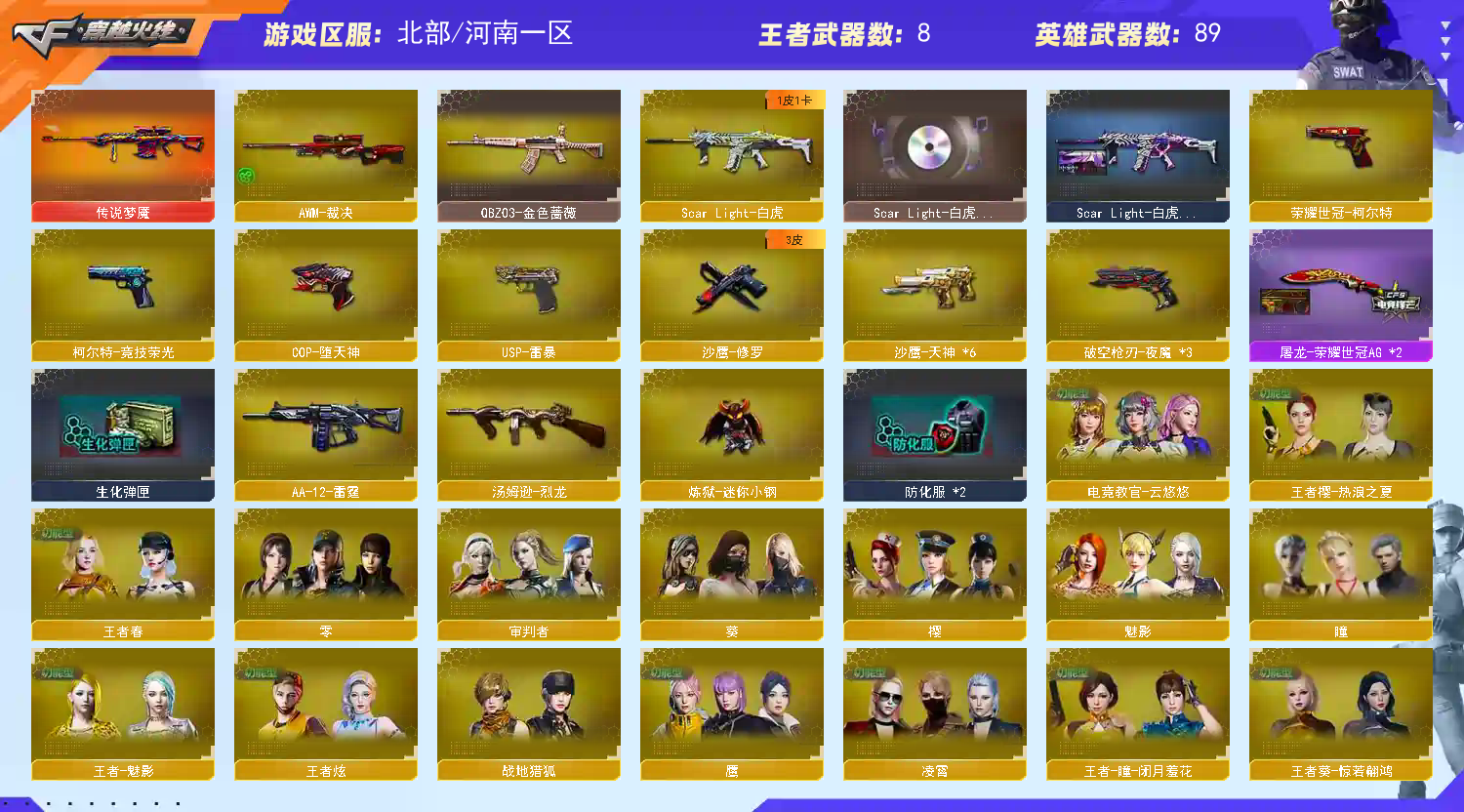 禁止开挂挂机;USP-雷暴,荣耀世冠-柯尔特,电竞教官-云悠悠,QBZ03-金色蔷薇,Scar Light-白虎,