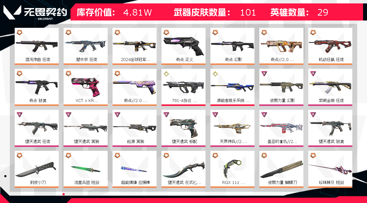 超时五分钟系统自动踢下线,因贪时间不不续费导致挂机禁赛,平台永久拉黑。时间不够可以提前续费,打完那局之后再撤单可以退回剩余租金。或者开一把死斗(非团队死斗)这样也不影响老板游戏体验。请及时续单,不挂机开挂押金24小时自动退回。 店铺所有账号均已备案、开挂必追究。 建议开始游戏前,wegame里面右键修复一下无畏契约, 这样就不会掉线影响老板游戏体验。 兄弟姐妹别挂机、开挂。祝你们玩得开心! 5W库奇点六件套24冠军套弃王套+混沌塑水宗紫金摩托狂徒+RNG爪刀剥皮侦查蝴蝶刀幻影+781獠犬;剥皮小刀,侦察力量 幻影,紫阙金琅 狂徒,堕天遗武 狂徒,混沌序曲 狂徒,塑水宗 狂徒,2024全球冠军赛 幻影,
