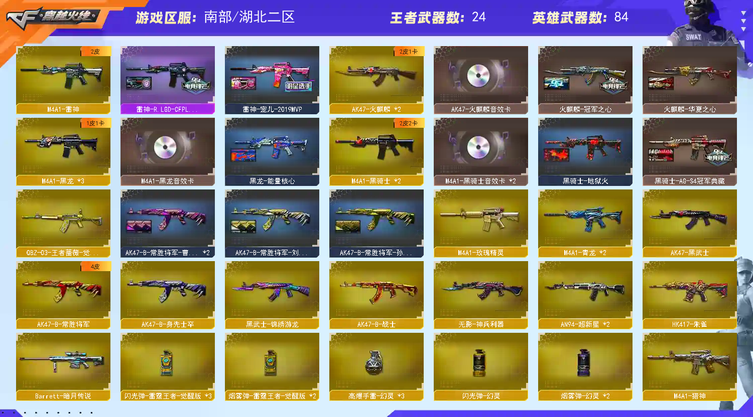 !!!!!!!!!!! 订单快结束禁止开排位,发现永久拉黑,可以打匹配,快结束开排位会导致禁赛 !!!!!!!!!!! 订单快结束禁止开排位,发现永久拉黑,可以打匹配,快结束开排位会导致禁赛 ❗️❗️❗️允许打字,但是请不要骂人和排位退出哦,否则永久拉黑! 排位中途退出会导致禁赛,如果发现立刻拉黑,请文明游戏!段位以游戏中为zhun!描述上的不保证对,玩家水平不一,段位会有浮动,所以不能以段位不符为由发起维权,违者一律永久拉入黑名单! 如果登号器显示动态密码错误,重新登陆即可 【战区】:南部战区 【账号类型】:爆破号生化号(有无需装弹和捕食者之眼) 【排位赛】:游戏中为zhun 【服务器】:湖北二区 ❤️角色 传说女帝 传说影煞(已开四防) 华 魅影 王者玲珑-小乔【已开4防】 灵狐者-职业经理【已开4防】 职业选手【有白鲨语音包】 有超级对讲机和手斧镜,永久生化服永久生化弹夹 6盘6烈+斯泰尔蝴蝶+炼狱(带斗鱼平台皮肤) 【王者武器系列】 王者蔷薇(觉醒) 王者冰魄(觉醒) 王者火魄(觉醒) 王者之击(觉醒) 王者之啸(觉醒) 炫金无影 炫金黑骑士 炫金千变 ❤️幻神音效卡4皮肤 【幻神N9-2022MVP 幻神AG-cfpls17冠军 幻神-周瑜 幻神宠儿-2021MVP 】 ❤️毁灭音效卡3皮肤 【毁灭-AG-cfpls15冠军 毁灭耀金皮肤 毁灭-战神张飞】 ❤️裁决 ❤️Kar98k-星神 ❤️巴雷特-朱雀 巴雷特-暗月传说 ❤️火麒麟音效卡3皮 【火麒麟-AG-STAR 火麒麟-华夏之心 火麒麟-冠军之心 】 ❤️雷神音效卡2皮 【雷神宠儿-2021MVP 雷神-R.LGD-cfpls18冠军】 ❤️黑龙音效卡1皮 【黑龙能量核心】 ❤️黑骑士音效卡双皮 【黑骑士地狱火 黑骑士AGs4冠军典藏】;传说影煞,传说女帝,RPK-盘龙,QBZ03-金色蔷薇,G36C-幻影,M200-幻神,Kar98K-星神,