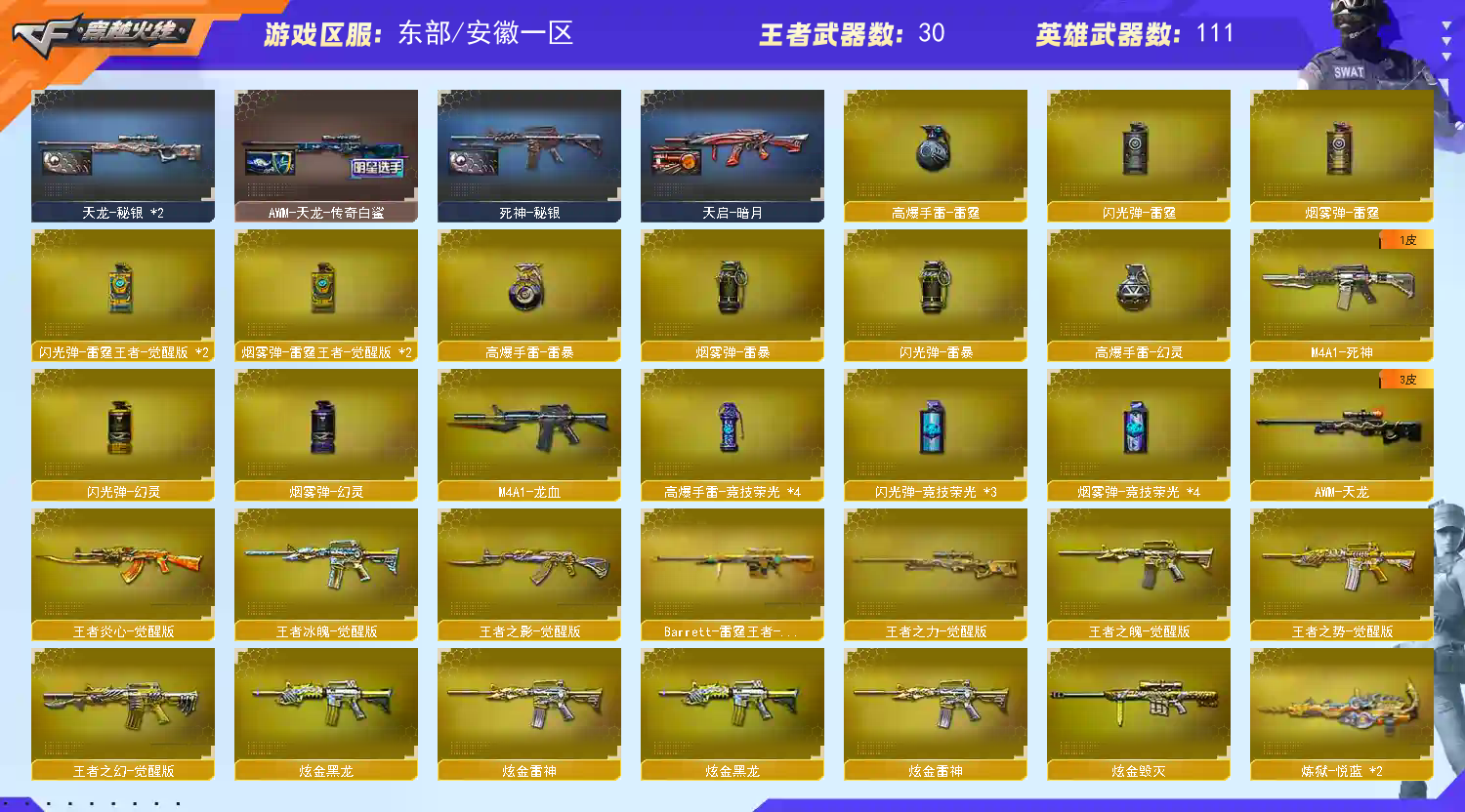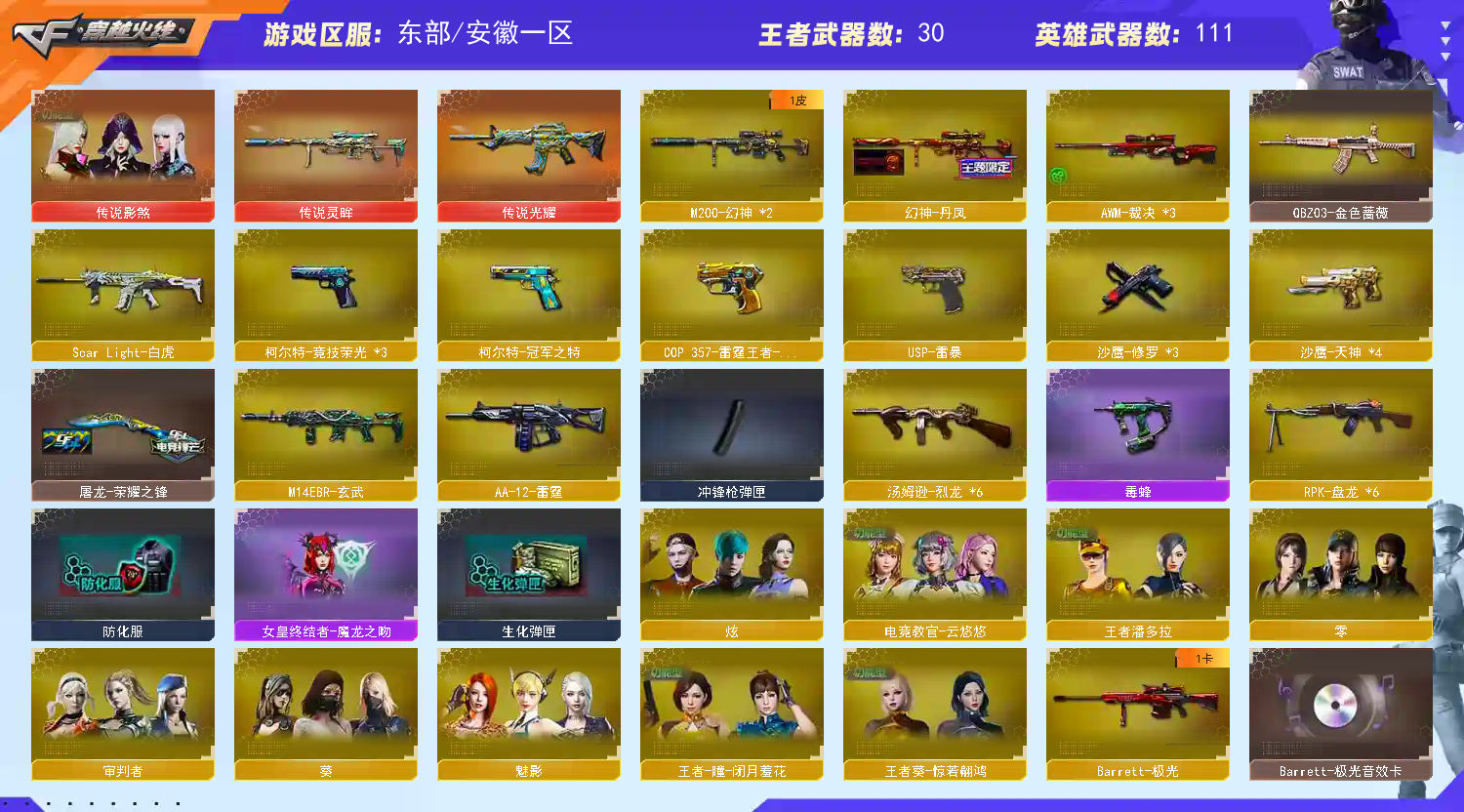 111V可排🔥传说影煞/传说灵眸/传说光耀/双幻神+丹凤🔥竞技/雷霆王者套🔥伏羲/传奇皮等四防【安徽一区登录】【炫金稀有顶1V介意者勿租】【恶意投诉、撤单不想玩了租错号了等非帐号问题1律拉黑】【此号已备案请勿以身试法】【开挂必究账号价值超高】详细武器请看下方 【重要套装】竞技荣光套装/雷霆王者套装/四防角色 【重要角色】传说影煞/魅影/审判者/_炫/_葵/_零/电竞教官-云悠悠/王者葵-惊若翩鸿/王者-瞳-闭月羞花/王者潘多拉/零-水下丽影/兰-海滩派对 【传说武器】传说光耀/传说灵眸 【英雄武器】_M200-幻神(2)/M200-竞技荣光/Barrett-毁灭/Barrett-极光/王者之怒-觉醒版/Barrett-雷霆王者-觉醒版/王者星神-觉醒版/AWM-天龙/AWM-裁决(3)/王者之力-觉醒版/M4A1-雷神(3)/雷神-葫芦兄弟/M4A1-死神/M4A1-黑龙(2)/M4A1-龙血/M4A1-千变(3)/M4A1-黑骑士(5)/黑骑士-海王(2)/M4A1-幻灵/M4A1-玫瑰精灵/王者之魄-觉醒版/王者之势-觉醒版/王者冰魄-觉醒版/王者之幻-觉醒版/Scar Light-白虎/M14EBR-玄武/AK47-火麒麟(2)/王者炎心-觉醒版/AK47-无影/无影-神兵利器/AK47-黑鲨/AK47-黑武士(2)/AN94-超新星/QBZ03-金色蔷薇/王者之影-觉醒版/9A91-烈火(2)/RPK-盘龙(6)/汤姆逊-烈龙(6)/AA-12-雷霆/COP 357-雷霆王者-觉醒版/沙鹰-天神(4)/沙鹰-修罗(3)/柯尔特-冠军之特/柯尔特-竞技荣光(3)/USP-雷暴/麒麟刺(4)/王者之刺-觉醒版/龙啸(2)/荣耀世冠-龙啸/王者之啸-觉醒版/擎天(6)/擎天-竞技荣光(4)/王者之击-觉醒版/屠龙(4)/雷霆之锋/幻灵之锋/王者之锋-觉醒版/斩神刀-雷暴/炽芒蝶刃/高爆手雷-幻灵/高爆手雷-雷暴/高爆手雷-雷霆/高爆手雷-竞技荣光(4)/烟雾弹-幻灵/烟雾弹-雷暴/烟雾弹-雷霆/烟雾弹-竞技荣光(4)/烟雾弹-雷霆王者-觉醒版(2)/闪光弹-幻灵/闪光弹-雷暴/闪光弹-雷霆/闪光弹-竞技荣光(3)/闪光弹-雷霆王者-觉醒版(2)/黑武士-锦绣游龙/王者风神-觉醒版 【王者武器】玫瑰精灵-悦动/炼狱-悦蓝(2)/雷霆王者之锋/王者玉锋/高爆手雷-雷霆王者(2) 【小人枪】M4A1-雷神-精英刀锋/牛牛-AK47/C.A.T/Barrett-夜玫瑰/冰火魔兽 【其他重要武器】炫金黑龙/炫金雷神/炫金毁灭/火麒麟-暗月/黑武士-能量核心/9A91-赤血龙魂(2)/AK-12-CFS2017纪念版/AK47-SS-9周年/9A91-平安夜/M4A1-樱花/M4A1-XS-赤龙/M4A1-秘银赤龙(7)/M4A1-电音/AK47-万圣节2018/AK47-SS-枪王排位/Scar-Light-赤血龙魂(2)/M4A1-樱(2)/9A91-蓝色骑士/AK12-枪王排位/AK47-破空冰刃/AK47-QT/M4A1-战龙/雷神-赛博幻想/AK47-朋克/AK47-十二生肖-蛇/M4CQBR-AP-孔明/神罚/FN弩炮-CFS2017纪念版/凤凰之力/AWM-涂鸦/M200-万圣节/AWM-蓝水晶/M200-情人节2019/M200-圣诞/雷蛇AWM/M200-涂鸦/AWM-恶棍(4)/黄金AWM/Barrett-耀龙/M200-大黄蜂/M200-庆典-CFS 2021/Barrett-苍龙/M200-萌杀/MG3-翔龙/KAC-情人节2021/EVO III-赤血龙魂/斯泰尔-巧克力/SPAS-12-雷电核心/Spas-12-幻能朋克/阐释者III/COP 357-青龙/凤凰之火/沙鹰-枪王排位(4)/愤怒公牛左轮-枪王排位/沙鹰-万圣节2018/新USP-怒火大圣/USP-黑大圣/Anaconda-情人节2021/新USP-枪王排位奖励(4)/无畏之矛/斩魔刀-怒火大圣/军用铁锹-赤龙/收割者-枪王排位/丛林匕首-枪王排位(2)/军用铁锹-飞龙在天/尼泊尔军刀-战龙/虹光女皇利刃-枪王排位/闪光弹-枪王排位(6)/胜利奖杯手雷-枪王排位 【重要武器皮肤】幻神-丹凤/雷神-荣耀世冠AG/毁灭耀金皮肤/毁灭-暗月/AWM-天龙-传奇白鲨/天龙-秘银/雷神-虎将/雷神-暗月/雷神-烈虎皮肤/雷神-星空/黑骑士-伏羲/黑骑士耀金皮肤/火麒麟-CFSTAR/火麒麟-AG/火麒麟-心动糖果/无影-暗月/AK-47-雷神/死神-秘银/天启-暗月/修罗-CFSTAR/屠龙-荣耀之锋/擎天-秘银 【重要光效】王者之影金色光效/王者星神原始光效/AK47-黑武士蓝色光效/AWM-天龙蓝色光效/加特林-炼狱蓝色光效/屠龙蓝色光效/巴雷特-毁灭蓝色光效/沙鹰-修罗蓝色光效/麒麟刺蓝色光效/龙啸蓝色光效/M200-幻神蓝粉色光效/M200-幻神紫橙光效 【重要音效卡】Barrett-极光音效卡/M4A1-黑骑士音效卡/M4A1-黑龙音效卡 【重要戒指】龙眼(死神)/龙眼(鹰)/银蛇戒/20赛季纪念戒指-耀金/21赛季纪念戒指-耀铜(食指)/21赛季纪念戒指-耀银(拇指)/22赛季纪念戒指-耀银(拇指)/23赛季纪念戒指-耀铜(食指)/23赛季纪念戒指-耀银(拇指)/24赛季纪念戒指-耀银(拇指)/26赛季纪念戒指-耀金(拇指);USP-雷暴,柯尔特-冠军之特,炽芒蝶刃,传说影煞,电竞教官-云悠悠,RPK-盘龙,QBZ03-金色蔷薇,