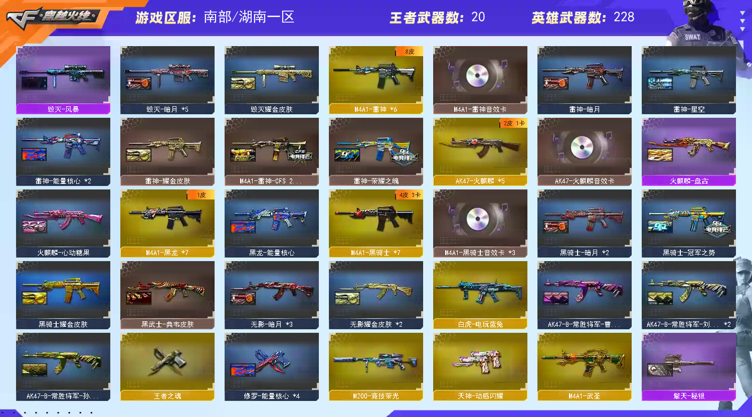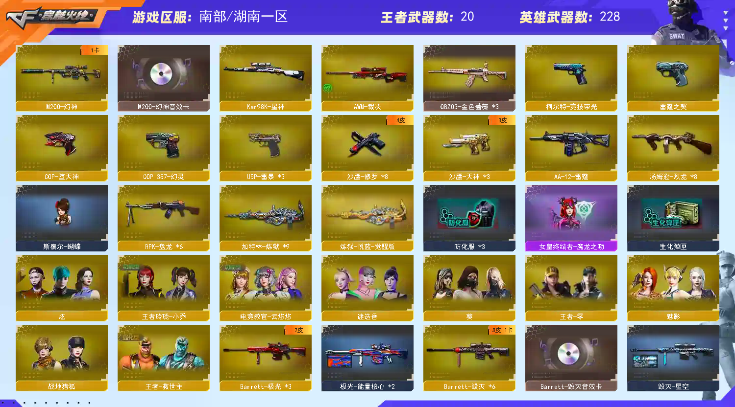 主武器:白虎-电玩蓝兔 HK417-朱雀 AK47-常胜将军 M4AI堕天神 AK-47雷暴 雷神×6(音效卡,耀金,CFS-2019,荣耀之魄,星空,暗月,能量核心)黑骑士×7(音效卡,耀金,暗月)黑龙×7(暗月,能量核心)机械迷城×3 QBZ金色蔷薇×3 猎神×1 死神×3(秘银)黑武士 无影×2(耀金,暗月)玫瑰精灵×2 火麒麟×4(音效卡 AG,CFS,雷神)猩红传说×6(老兵皮肤)武圣 龙血×2 黑鲨×4 9A91烈火 超新星 天启 M4A1雷霆 雷神-精英刀锋 C.A.T 金色小号 AK47-战士 AK47-战神(全皮肤) M200电竞荣光 98K星神 M200幻神(音效卡) 毁灭×5(音效卡,耀金,暗月,星空)天龙×2(CFS 能量核心)极光×3(能量核心)暗月传说×2 裁决 Barrett雷霆 炼狱×9 盘龙×6 烈龙×7 AA12雷霆 副武器:柯尔特电竞荣光 COP幻神 USP雷暴×3 修罗×8(能量核心)天神×3(暗月)COP雷霆 COP堕天神 近战武器:斩神刀雷暴 屠龙×8 麒麟刺×4 龙啸×3 擎天×4(秘银)尼泊尔雷霆 屠龙(秘银×3) 降世魔童 麒麟刺堕天神(×2) 龙啸堕天神 王者炫金:王者之啸(觉醒 )王者之戮(觉醒)王者冰魄 王者之魄×2(觉醒) 王者之心 王者之怒 王者之势(觉醒) 王者之武(觉醒)王者之幻(觉醒) 王者之魂 王者之击(觉醒)王者之光×2 炼狱悦蓝(觉醒) 烈龙悦心 炫金超新星×2 炫金武士 炫金雷神×3 炫金天神×3 炫金千变 炫金骑士 炫金火麒麟 炫金黑龙 炫金天龙 炫金毁灭×2 巴雷特-零-水下丽影 火麒麟-灵狐 天龙-曼陀罗 机械青龙 火麒麟-暗月×3 黑武士-暗月×2 角色:王者玲珑-小乔 王者-零-传说之路 魅影 炫 葵 王者零 王者救世主 迷迭香 生化:六盘炼狱,六烈斯太尔/死亡之眼 不要拿我号卡BUG,发现直接黑名单;USP-雷暴,电竞教官-云悠悠,RPK-盘龙,QBZ03-金色蔷薇,M200-幻神,Kar98K-星神,