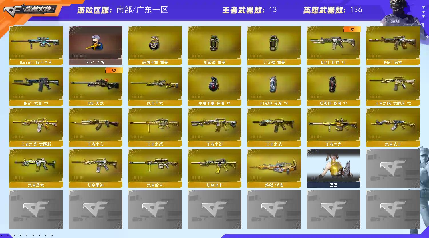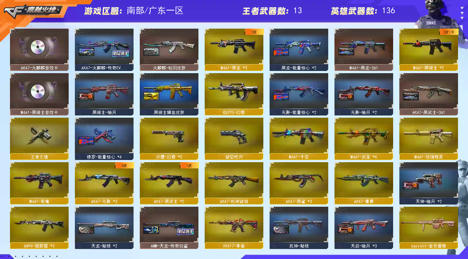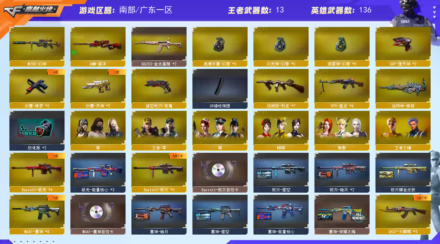 难不号 136V🔥幻神/朱雀/蝴蝶🔥夜魔/雷暴/幻兽套装🔥传奇EVE/白鲨/轻羽/冠军/能量核心皮【广东一区登录】【炫金稀有顶1V介意者勿租】【恶意投诉、撤单不想玩了租错号了等非帐号问题1律拉黑】【此号已备案请勿以身试法】【开挂必究账号价值超高】详细武器请看下方 【重要套装】幻兽套装/夜魔套装/雷暴套装 【重要角色】_樱/_蝴蝶_/_葵/魅影/王者之瞳/王者-零/铁骑荣耀/零-水下丽影/兰-海滩派对/新灵狐者 【英雄武器】_M200-幻神/Barrett-毁灭(5)/Barrett-极光(4)/barrett-金色蔷薇/Barrett-暗月传说/AWM-天龙/AWM-裁决/M4A1-雷神(4)/M4A1-死神(4)/M4A1-黑龙(3)/M4A1-龙血(3)/M4A1-千变/M4A1-黑骑士(2)/M4A1-武圣(4)/M4A1-夜魔/M4A1-猎神/M4A1-玫瑰精灵/王者之魄-觉醒版(2)/王者之势-觉醒版/HK417-朱雀/QBZ95-幻兽/AK47-火麒麟(3)/AK47-无影(3)/AK47-雷暴/AK47-黑鲨(3)/AK47-黑武士(2)/AK47-机械迷城/AN94-超新星(3)/QBZ03-金色蔷薇(2)/9A91-烈火/RPK-盘龙(6)/汤姆逊-烈龙(7)/加特林-炼狱/COP-堕天神(2)/沙鹰-天神(2)/沙鹰-修罗(5)/沙鹰-幻兽(5)/_破空枪刃_/破空枪刃-夜魔/麒麟刺/龙啸(6)/擎天/屠龙(6)/马来剑-夜魔/女皇利刃-幻兽/斩神刀-雷暴/高爆手雷-幻兽(5)/高爆手雷-雷暴/高爆手雷-夜魔(4)/烟雾弹-幻兽(5)/烟雾弹-雷暴/烟雾弹-夜魔(4)/闪光弹-幻兽(5)/闪光弹-雷暴/闪光弹-夜魔(4) 【王者武器】王者之武/王者之幻/王者之心/王者之怒/王者之光/炼狱-悦蓝/王者之魂/王者之击 【小人枪】M4A1-刀锋/AWM-灵狐-15周年嘉年华/M37-葵/COP-旗袍/魔能飞环-曼陀罗/迷你生化手雷 【其他重要武器】炫金雷神/炫金黑龙/炫金骑士/炫金武士/炫金天龙/炫金毁灭/火麒麟-能量核心(2)/火麒麟-暗月/激光毁灭者III/AK47-泰坦破坏者III/AK12-枪王排位(2)/M4A1-樱花/AK-12-CFS2017纪念版(2)/M4A1-XS-翔龙/9A91-2017万圣节/9A91-蓝色骑士/AK47-樱花/G3A3-SS-枪王排位/AK47-肯德基/M4A1-秘银赤龙(7)/AK47-娜塔莎/M4A1-紫狱(2)/AK103-神秘黑洞/AK47-SS-枪王排位(2)/联想锋行黄金AK/AK47-B-十周年/AK47-死亡之翼/黄金AK-47/AK47-十年火线(3)/AK12-幽灵/M4A1-战龙/AK47-狂欢-CFS/M4A1-破空冰刃/AK47-轮回/HK417-赤血龙魂/9A91-赤血龙魂/FN弩炮-CFS2017纪念版(2)/M200-圣诞/M200-万圣节/AWM-圣诞/暗金M200/M200-赤血龙魂/Barrett-炎龙(3)/AWM-恶棍-枪王排位(2)/AWM-7周年/AWM-涂鸦/MG3-翔龙(3)/MG4-蓝色骑士/斯泰尔-巧克力(2)/EVO III-赤血龙魂(4)/神圣爆裂者/SPAS-12-雷电核心/愤怒公牛左轮-枪王排位(2)/凤凰之火/凤凰之灵(2)/COP-金蝉子-枪王排位/沙鹰-枪王排位(3)/新USP-枪王排位奖励(3)/Cop357-赤龙(2)/鹰爪-枪王排位/尼泊尔军刀-9周年/唐刀-九五至尊/幻影扳手-枪王排位/虹光丛林匕首-枪王排位/蝴蝶刀-枪王排位/啸天/收割者-枪王排位/丛林匕首-枪王排位/闪光弹-枪王排位(4)/胜利奖杯手雷-枪王排位 【重要武器皮肤】巴雷特-毁灭-CFPL冠军/毁灭-星空/毁灭耀金皮肤/毁灭-暗月/极光-能量核心/AWM-天龙-传奇白鲨/天龙-CFSTAR/天龙-秘银/AK47-火麒麟-传奇EVEN/火麒麟-CFSTAR/火麒麟-AG/火麒麟-轻羽皮肤/无影-暗月/无影-能量核心/AK47-黑武士-361/M4A1-雷神-白鲨皮肤/雷神-荣耀之魄/雷神-暗月/雷神-能量核心/雷神-星空/黑骑士耀金皮肤/黑骑士-暗月/黑龙-能量核心/M4A1-黑龙-361/死神-秘银/天启-暗月/修罗-CFSTAR/修罗-能量核心/天神-暗月 【重要光效】王者之影金色光效/王者之锋金色光效/王者之魄金色光效/AK47-火麒麟蓝色光效/AK47-黑武士蓝色光效/AN94-超新星蓝色光效/AWM-天龙蓝色光效/M4A1-死神蓝色光效/RPK-盘龙蓝色光效/加特林-炼狱蓝色光效/屠龙蓝色光效/巴雷特-毁灭蓝色光效/擎天蓝色光效/汤姆逊-烈龙蓝色光效/沙鹰-修罗蓝色光效/麒麟刺蓝色光效/龙啸蓝色光效/AK47-火麒麟蓝粉色光效/AK47-黑武士蓝粉色光效/M4A1-武圣蓝粉色光效/M4A1-死神蓝粉色光效/M4A1-雷神蓝粉色光效/M4A1-黑骑士蓝粉色光效/M4A1-黑龙蓝粉色光效/AWM-蓝粉色光效/沙鹰-修罗蓝粉色光效/AN94-超新星蓝粉色光效/Barrett-极光红绿光效/Barrett-毁灭红绿色光效/M4A1-雷神红绿光效/M4A1-千变紫橙光效/屠龙紫橙光效/王者之击紫色光效/M4A1-千变绿色光效/M4A1-雷霆王者原始光效 【重要音效卡】M4A1-黑骑士音效卡/M4A1-雷神音效卡/Barrett-毁灭音效卡/AK47-火麒麟音效卡 【重要戒指】8周年戒1/8周年戒2/15周年限定戒指/龙眼(死神)/龙眼(鹰)/16赛季纪念戒指-枪王耀银/17赛季纪念戒指-耀金/18赛季纪念戒指-耀金/20赛季纪念戒指-耀金/21赛季纪念戒指-耀银(拇指)/22赛季纪念戒指-耀银(拇指)/23赛季纪念戒指-耀银(拇指)/24赛季纪念戒指-耀铜(食指)/24赛季纪念戒指-耀银(拇指);RPK-盘龙,QBZ03-金色蔷薇,M200-幻神,