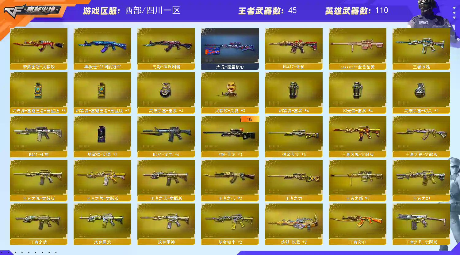 【角色】:传说女帝,王者玲珑,王者-春,王者-瞳-闭月羞花,王者-魅影,王者-零-国色天香,炫, 【王者】:王者蔷薇(觉醒)1,王者幻神(觉醒)1,王者火魄(觉醒)1,王者冰魄1,王者炎心1,王者之心1,王者之心(觉醒)1,王者之魂2,王者之魄(觉醒)1,王者之力1,王者之怒2,王者之锋1,王者之影1,王者之武2,王者之势1,王者之击1,王者之鲨1,王者之啸1,炼狱-悦蓝2,王者之刺觉醒1, 【主武】:幻神2,王者幻神1,雷神6,传说光耀1,传说圣灵1,白虎1,朱雀1,98k星神1,9A91-烈火2,加特林-炼狱4,斯泰尔蝴蝶1,汤姆逊-烈龙6 , 【皮肤】:幻神-冠军之幻(皮肤),幻神-周瑜(皮肤),幻神-黄忠(皮肤),屠龙-荣耀之锋(皮肤),雷神-荣耀之魄(皮肤),火麒麟-冠军之心(皮肤),黑骑士-地狱火(皮肤)毁灭-冠军之怒(皮肤),毁灭-S16冠军(皮肤), 【音效卡】:雷神- 音效卡,幻神-音效卡,毁灭-音效卡 ,黑骑士-音效卡 【副武】:usp-雷暴1,雷霆王者cop3,世冠-柯尔特 【近身】: 屠龙5,王者之锋1,雷霆王者1,王者之啸1,王者之击1,王者刺1,幻灵之锋1,金刚伞1, 【投掷】:雷暴手雷4套 ,雷霆王者3套,幻灵1套, 【道具】:烟雾头、防弹头、防弹衣、手雷包、C4工具钳、手枪弹匣、散弹弹匣、冲锋弹匣、步枪弹匣、机枪弹匣、狙击弹匣、透明头盔、透明护目镜、闪光护目镜、14个背包 【亲爱的租客烦请爱护此号,当成自己号玩,西部枪王排位段,喜欢的老板请收藏,已经刷好的属性请勿更换,感谢】;USP-雷暴,荣耀世冠-柯尔特,传说女帝,M200-幻神,Scar Light-白虎,Kar98K-星神,
