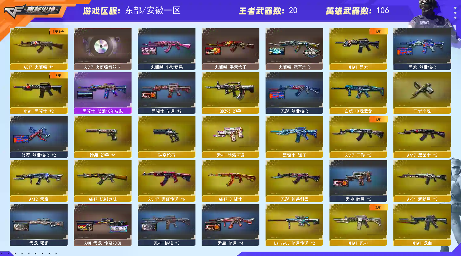 【AH154】电信安徽一区(东部大区)117V 幻兽套 六盘龙六烈龙6盘龙6烈龙6烈6盘六盘六烈 爆破全装 【昵称】Black·科比 【角色】元帅 、VIP4、葵、魅影、王者-救世主X2、新海豹突击队X2、蜀雪、堕天使、幻影 【主武】王者之幻、王者之心、王者之势、王者之怒、王者之光、王者之影、炫金骑士X2、炫金火麒麟、炫金雷神、炫金天龙、炫金武士、AK47-火麒麟X3、M4A1-黑龙、M4A1-雷神X3、M4A1-黑骑士X2、AK47-无影X2、M4A1-死神、AK47-黑武士X2、AK12-天启、AN94-超新星X3、AK47-机械迷城、M4A1-龙血、QBZ95-幻兽、QBZ03-金色蔷薇X2、AK-47-猩红传说X5、AK47-B-战士、AWM-天龙、Barrett-毁灭X5、Barrett-极光、AWM-裁决X3、M200-幻神、Barrett-暗月传说、RPK-盘龙X8、加特林-炼狱X2、炼狱-悦蓝、汤姆逊-烈龙X6、死亡之眼、9A91-赤血龙魂X9、源·青龙 【副武】炫金修罗、王者之魂、沙鹰-修罗X5、沙鹰-天神、破空枪刃、沙鹰-幻兽X4、Cop357-迷彩 【近身】王者之锋X8、王者之击、王者之刺、屠龙X5、龙啸、擎天、麒麟刺X4、女皇利刃-幻兽、屠龙-秘银 【投掷】高爆手雷-幻兽X4、闪光弹-幻兽X4、烟雾弹-幻兽X4、高爆手雷-麒麟、手雷-CFS2017纪念版X2、闪光弹-CFS2017纪念版、烟雾弹-CFS2017纪念版X2、凤凰之息X2 【道具】超级背包X2、炫彩背包、闪光护目镜 16487天4小时、烟雾保护头盔X2 10824天19小时、防弹衣 291天23小时、防弹头盔X3、手雷包X2、C4工具钳X3、手枪弹匣 1470天20小时、步枪弹匣X2、狙击枪弹匣 2652天、散弹枪弹匣 1362天、银蛇戒 【皮肤】火麒麟-冠军之心、雷神-荣耀之魄、毁灭-荣耀之怒、屠龙-荣耀之锋X2、修罗-CFSTAR、毁灭耀金皮肤、无影-能量核心、修罗-能量核心、极光-能量核心、天龙-秘银、死神-秘银X3、AWM-天龙-传奇70KG、天启-暗月X5、黑骑士-暗月X2、毁灭-暗月X4、天神-暗月X2、黑龙-暗月X2、雷神-暗月 【音效】火麒麟音效卡、毁灭音效卡 【生化】生化弹匣 19天14小时、机枪弹匣 1960天、冲锋枪弹匣X2 1577天、变异宝贝、疯狂宝贝 595天8小时 【光效】M4A1-雷神红绿光效、Barrett-毁灭金色光效 【玩偶】暴躁猪猪玩偶 【战场】电击兵、爆破兵、猎弩兵X2、医疗兵、突击兵、重甲兵、火箭兵、战旗兵、谍报兵、坚盾兵、炸弹兵 【挑战】巨龙咆哮Ⅲ、AK47-泰坦破坏者III、激光毁灭者III、征服者、乱世X4、M240B-苍雷X4 【更新日期】21·4·7 【英雄武器】:98 【王者炫金】:24 【东部战区】福建一区、安徽一区、上海一区、浙江一区、浙江二区、江苏一区、江苏二区、教育网区、移动专区、福建电信一区、安徽电信一区、上海电信一区、上海电信二区、浙江电信一区、浙江电信二区、江苏电信一区、江苏电信二区、教育电信网区、移动电信专区(CF相同战区进入相同频道可以一起玩);RPK-盘龙,QBZ03-金色蔷薇,M200-幻神,