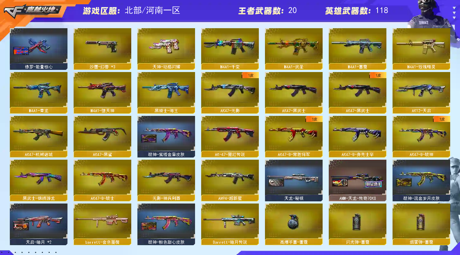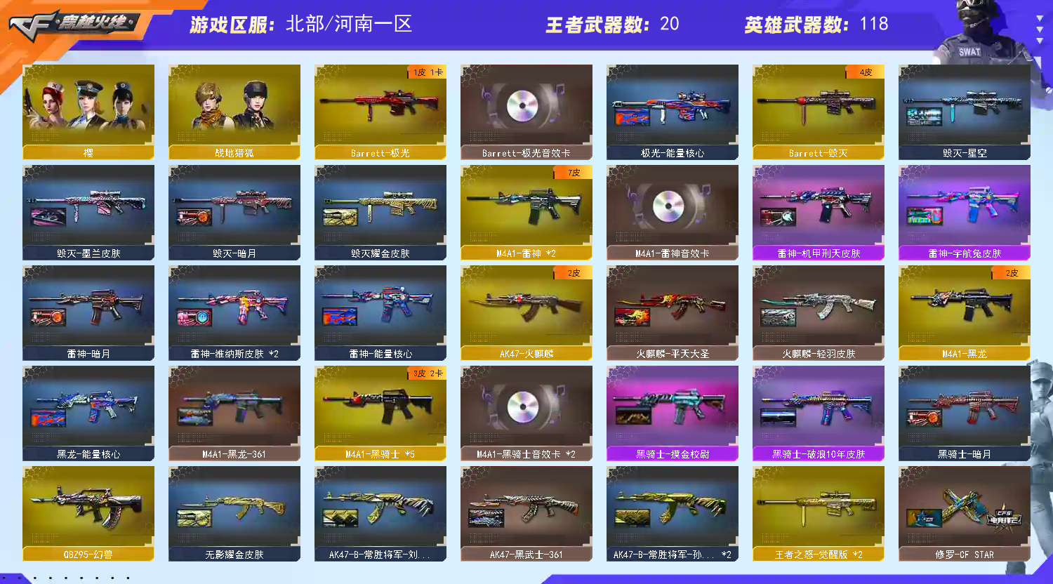 【道具】AK47-黑武士361 黑龙361 炼狱星空 AWM-天龙传奇70KG 黑骑士幻能朋克 火麒麟轻羽皮肤 毁灭耀金皮肤 无影耀金皮肤 黑骑士音效卡*2 雷神音效卡 【主武器】千变 火麒麟 黑龙*2 雷神 黑骑士*5 无影*2 死神 黑武士*2 天启 超新星 武圣 M4A1-雷霆 青龙 M4A1-堕天神 M14EBR玄武 烈火动感闪耀 玫瑰精灵 QBZ95-幻兽 QBZ03-金色蔷薇 烈火*2 王者之魄 王者之势 王者之幻*2 猩红传说 战士 战神 身先士卒 常胜将军 毁灭 极光*3 裁决 雷霆大炮 M200-幻神 朱雀大炮 王者之怒 暗月传说 盘龙*6 炼狱*5 盘龙悦心 炼狱悦蓝 烈龙*7 烈龙云海游龙 AA-12-雷霆*2 魂QBZ03-金色蔷薇-萌杀 魂黑鲨青花瓷 雷神赛博朋克 源火麒麟 源雷神 源黑骑士 炫金雷神 AWM-裁决-百城联赛天津 魂朱雀新春神龙 魂毁灭航天科技 王者之怒 源毁灭 源天龙 炼狱迷你小刚 炼狱悦蓝 爆炎激光超越MAX 斯太尔-蝴蝶 【副武器】修罗*4 天神*2 武圣 COP357-雷霆 COP-堕天神 天神动感闪耀 幻兽*3 王者之灵 修理年鹏 源天神 阐释者III 旗袍 大黄蜂 MAC-10-涂鸦 【近身武器】屠龙*4 龙啸 擎天 麒麟刺 尼泊尔-雷霆 麒麟刺堕天神 龙啸堕天神 擎天竞技荣光 屠龙动感闪耀 擎天云海游龙 屠龙云海游龙 女皇利刃幻兽 王者之锋 王者之啸*2 王者之击*3 王者之刺 迷你宝贝 魂屠龙春桃 龙啸烈火龙威 荣耀之证 猫猫手套 【投掷武器】雷霆套 堕天神套 竞技荣光套 手雷动感闪耀 手雷云海游龙 幻兽套*3 迷你生化手雷 高爆雷蛇 【角色】隼 传说艾丽莎 葵 迷迭香 乔伊教练 王者葵貂蝉 王者玲珑小乔 樱 云海玲珑 炫 四防角色N个;隼,传说艾莉莎,RPK-盘龙,QBZ03-金色蔷薇,M200-幻神,Scar Light-白虎,