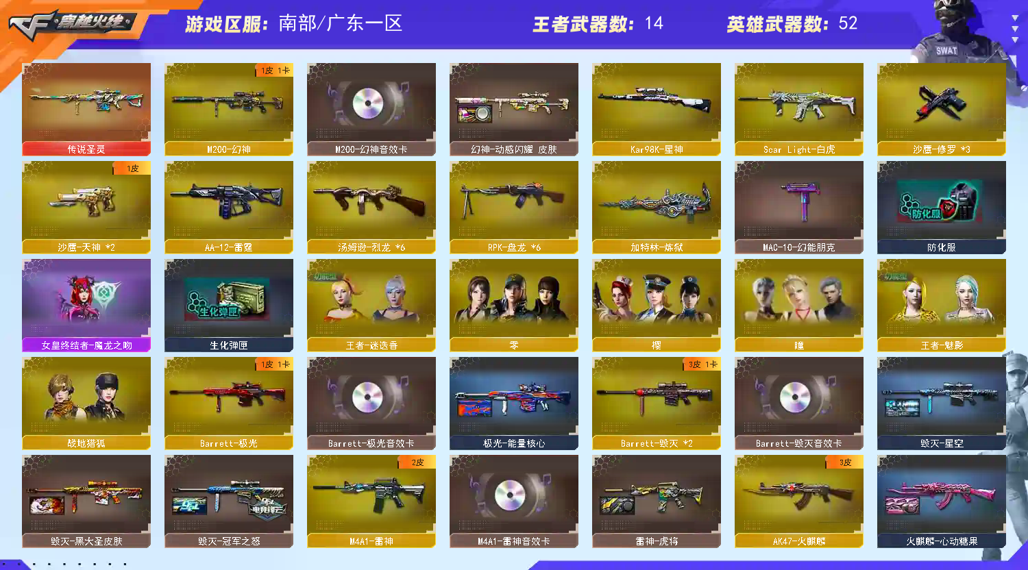 首页 > 租号大厅 > 穿越火线 > 电信区/广东一区 > 南部M-200幻神带幻神音效卡+98K星神传说圣灵Scar白虎网剧整套+6烈6盘6炼狱死亡之眼