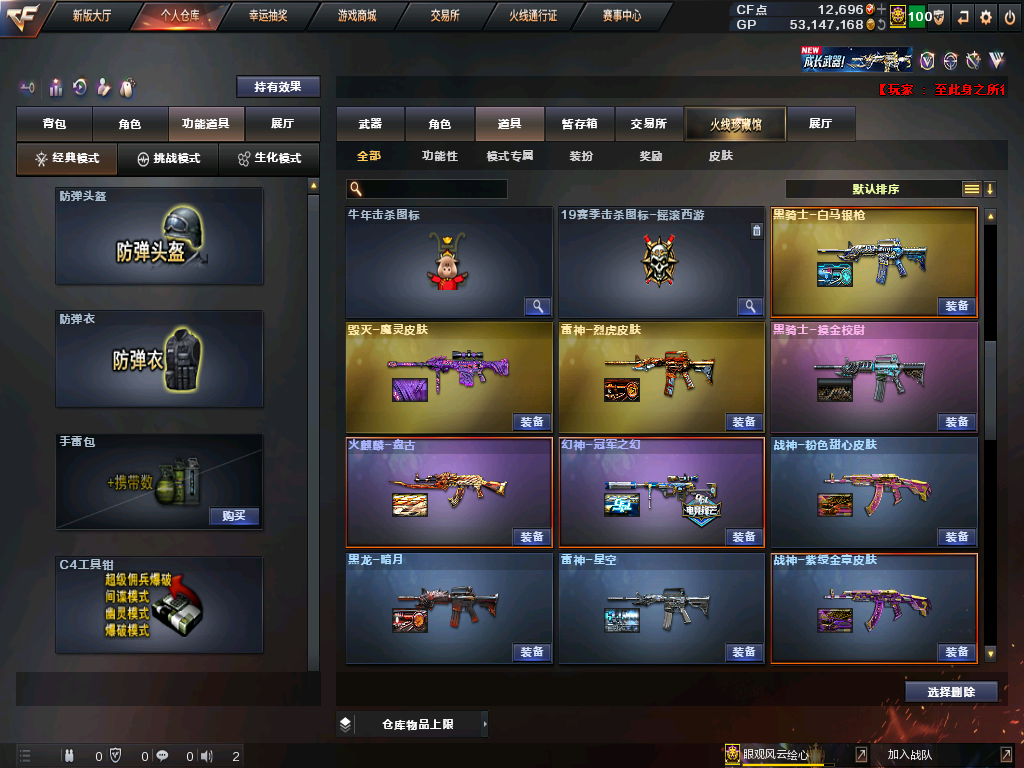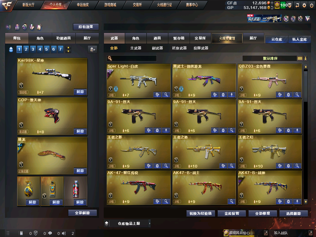 爆破号 生化号 双全装 ---步枪 雷神 Qbz 白虎 黑骑士 黑龙 火麒麟 无影 ---狙击枪 M200-幻神(冠军之幻) M200-竞技荣光 98k-星神(音效卡) 传说梦魇 ---手枪 cop-堕天神 usb-雷暴 柯尔特-竞技荣光 ---机枪/冲锋枪 悦蓝-炼狱 炼狱-小刚 炼狱 6盘龙 斯太尔-蝴蝶 毒蜂 6烈龙 ---近身武器 云龙扇 王者之锋;USP-雷暴,沙漠玫瑰,电竞教官-云悠悠,RPK-盘龙,QBZ03-金色蔷薇,M200-幻神,Scar Light-白虎,